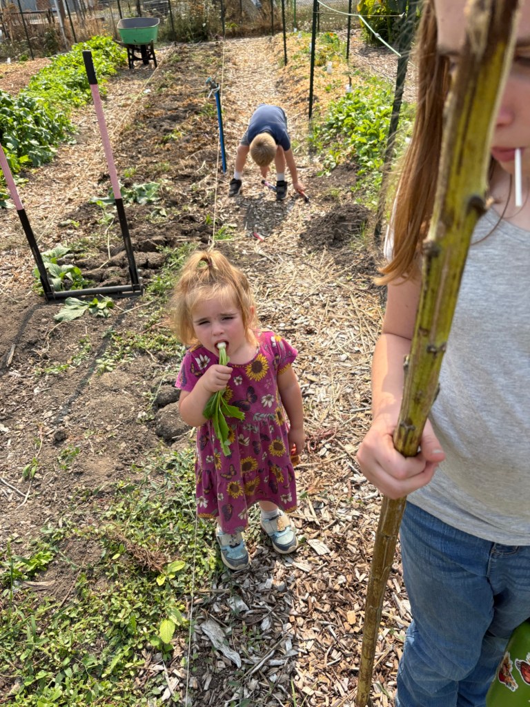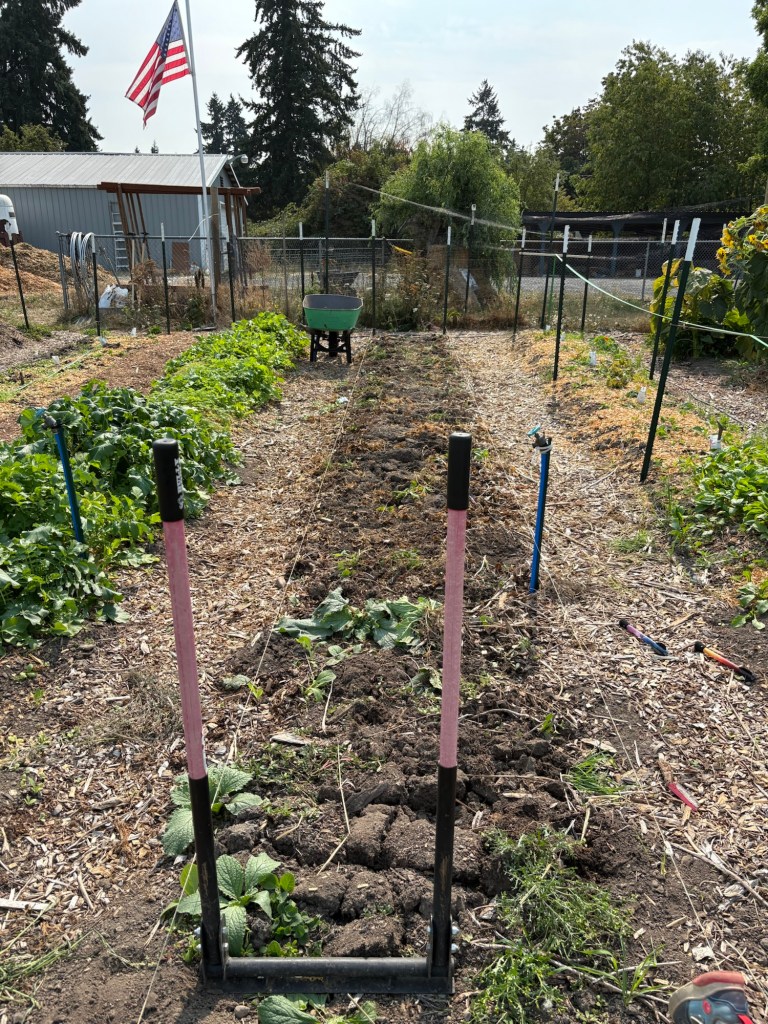 Next was to go through and broad fork the whole row to loosen it up so we could pull out the weeds.