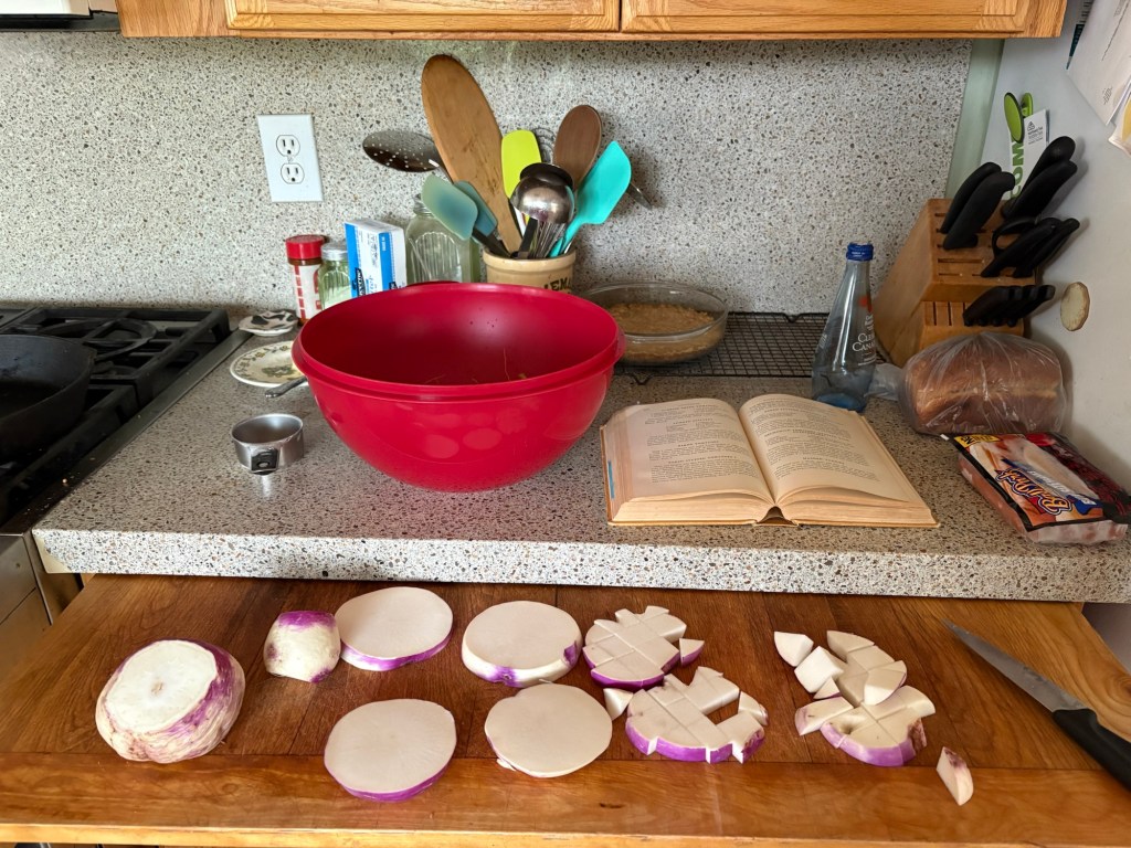 They were not, unfortunately, universally popular. They have some potential, but need a little jazzing up, and probably would be better if we shredded instead of dicing the turnips, for a better consistency. But it was our first time making them, and they weren’t terrible. We will try again some other time.