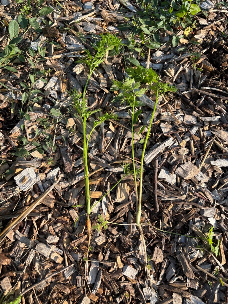 Carrot and hemlock next to each other. You can see the similarities, but also the differences. The hemlock has the telltale purple spots, and the lobes of the leaves are wider. The stems are also hollow. On the other hand, because we do not eat the carrot leaves, only the roots, there is less risk of inadvertently including a hemlock leaf in a harvest.