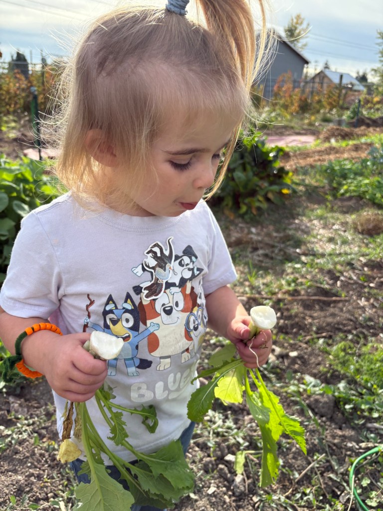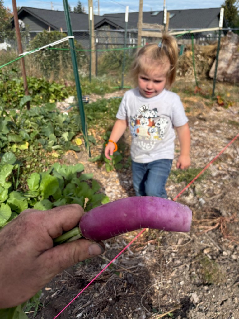 This is a radish. We have been experimenting with different kinds of radish this year, and there have been so many new ones, like this long, peppery purple variety.