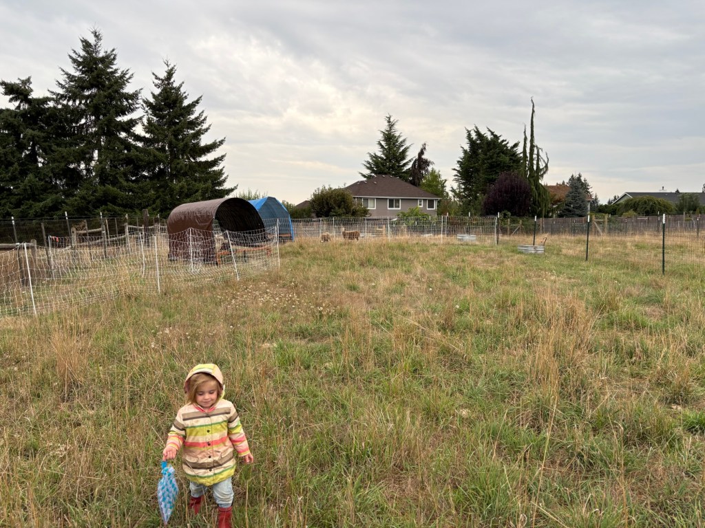 The sheep and pigs have been sitting still at the east end of the North pasture for the last 2-3 weeks. This is because with the dry season extending all the way to the end of September now, the pasture has not recovered like we hoped it would. The grass was stuck at 4-6″ of growth. This is not adequate for heavy grazing. We want to leave at least 4″ of bulk, because that is where most of the plant’s sugar reserves are stored for next year. If we graze below this the plant will have to slough off roots and use up root sugar stores to grow back in the spring. This will slow grass growth and give weeds a head start (trust me, they don’t need any more help).