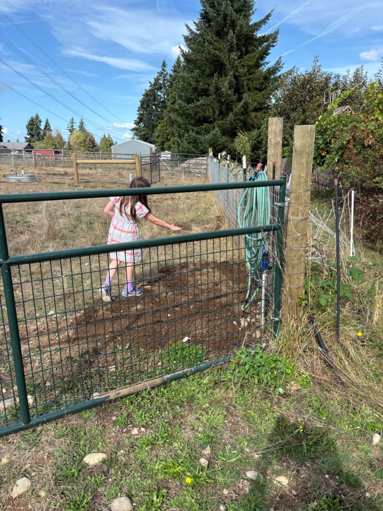 The worst is here next to the hydrant. So we spread them all with a Northwest pasture blend from the local feed store and the remnants of a bag of daikon radishes. I know, not very scientific, but it is what we can afford right now, in terms of time and money.