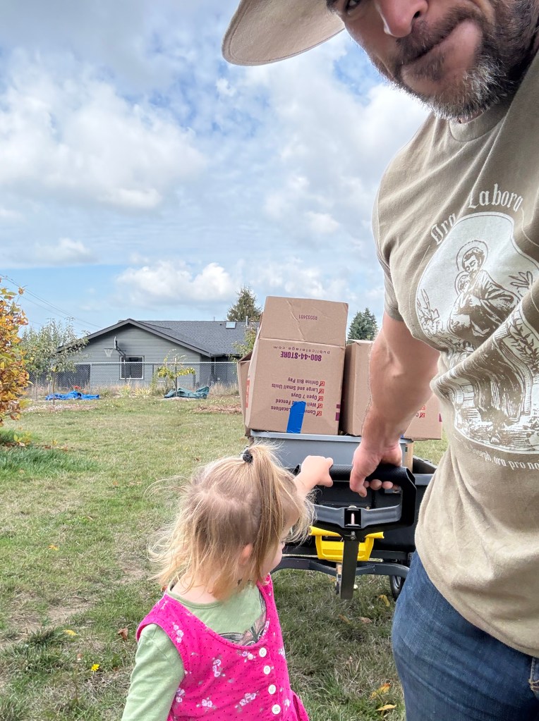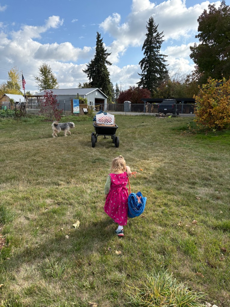 Mommy and Daddy took a break at recess to sit on the tailgate of the new truck and watch the kids run amok on the playground. Then Winnie came back to the farm to help set up.