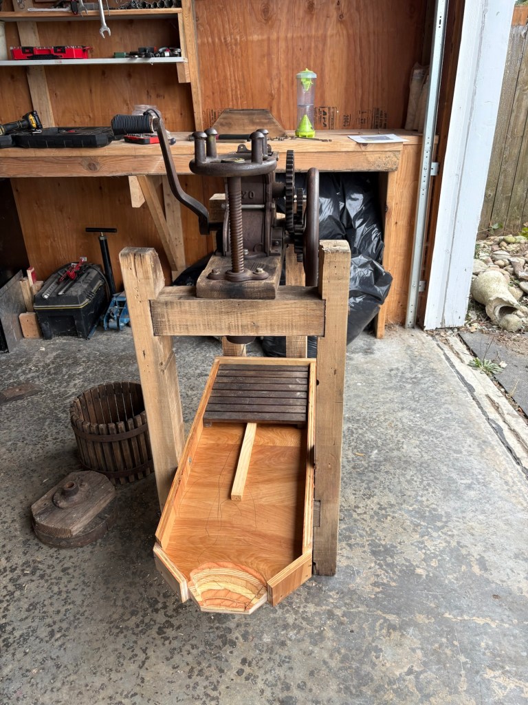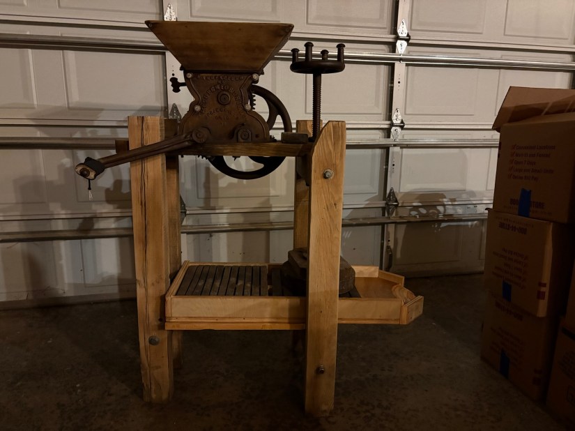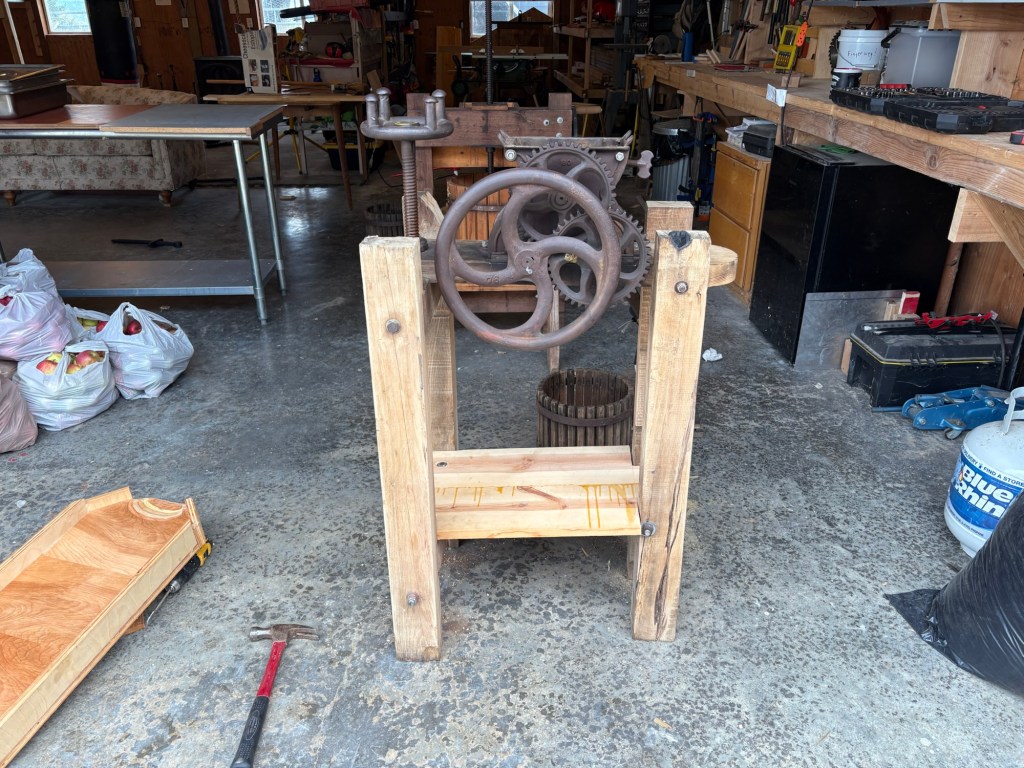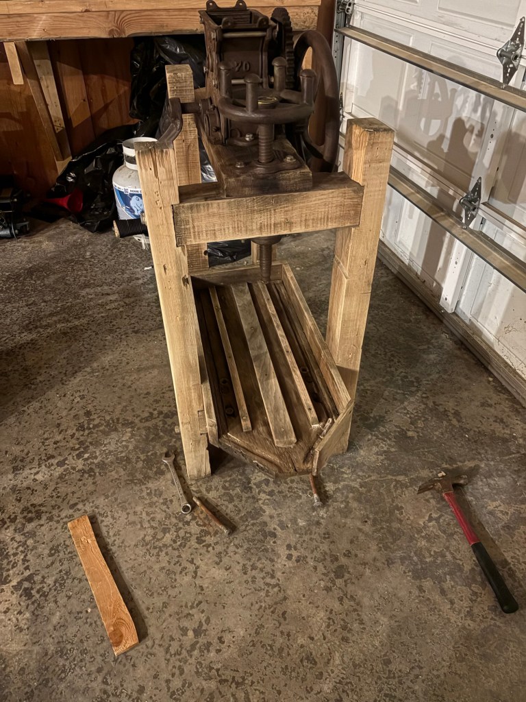 So we took the tray off the press. Initially I thought about trying to repair it, but the wood had too many rotten spots, and there was some mold in the juice channels. It looked like getting it clean enough to process cider was going to be more trouble than it was worth.