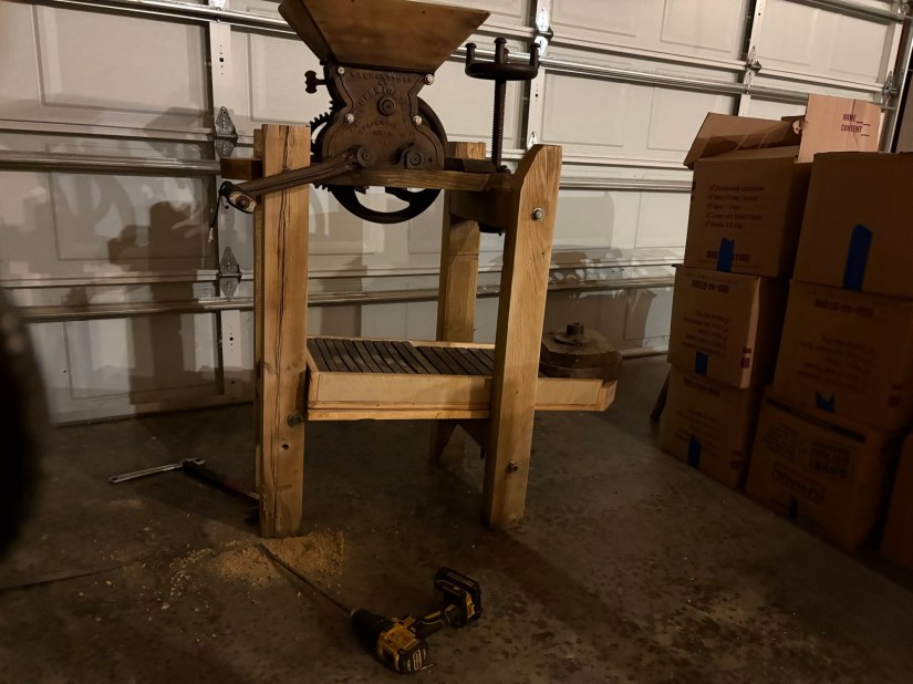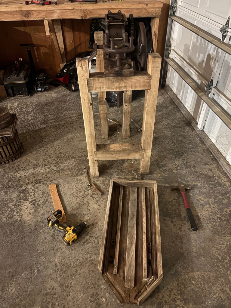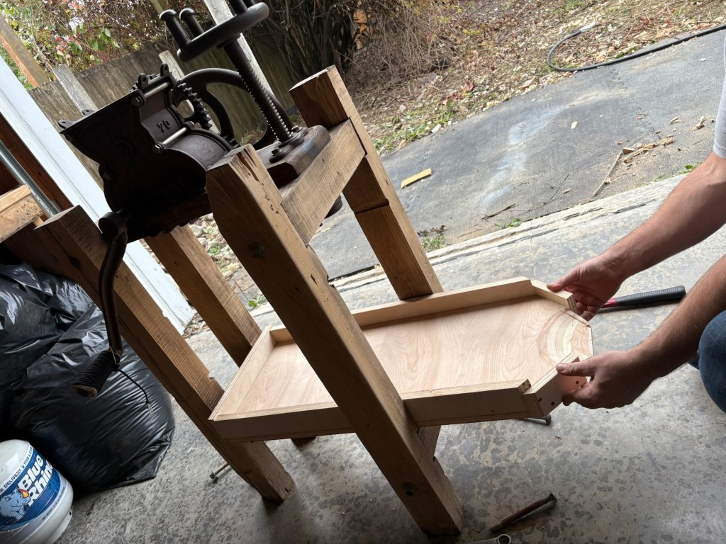 I had some leftover hardwood plywood from the drafting table project, and the table saw miter guide project, so that’s what I used. Would hardwood planking with hand crafted joinery be more authentic on a 19th century cider press?