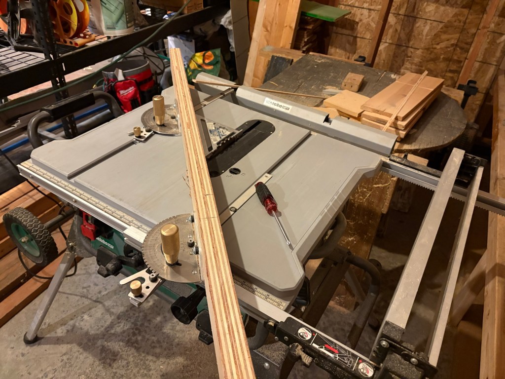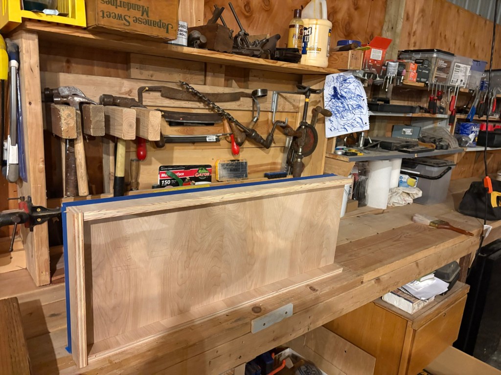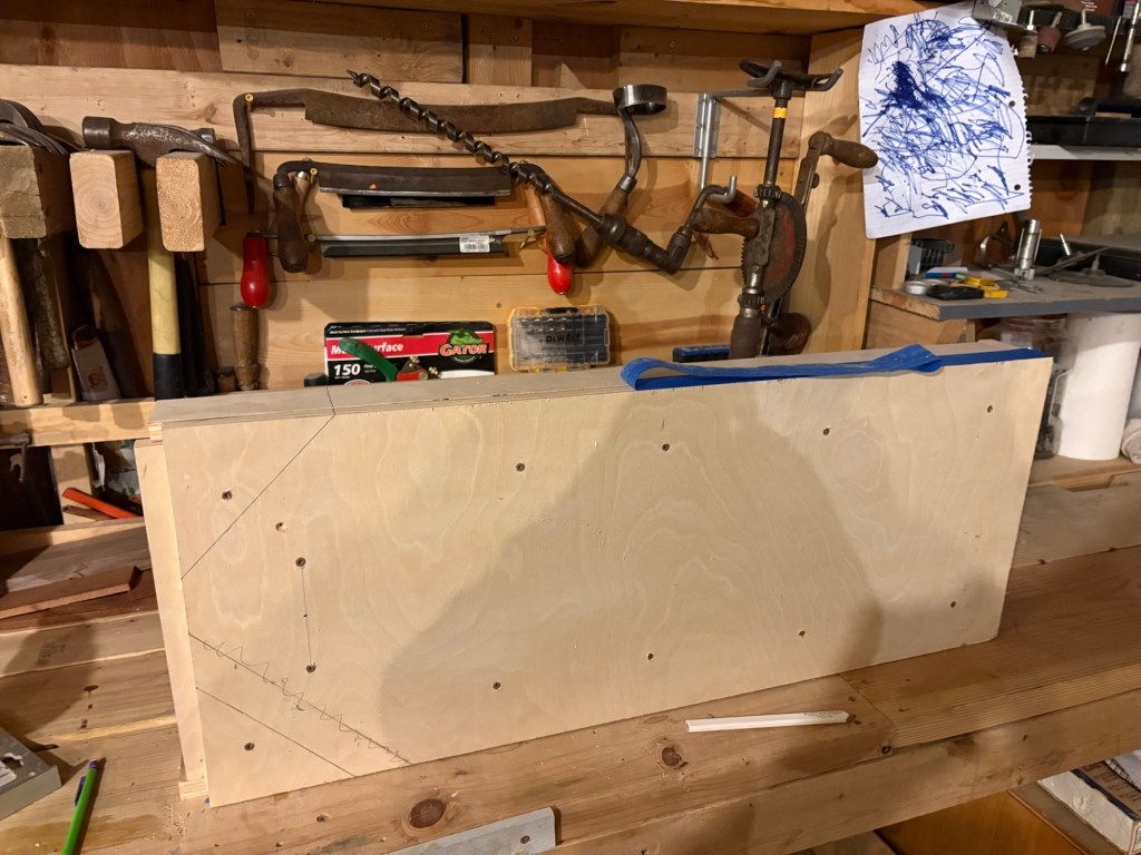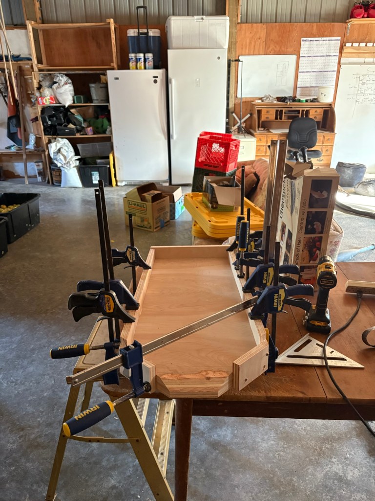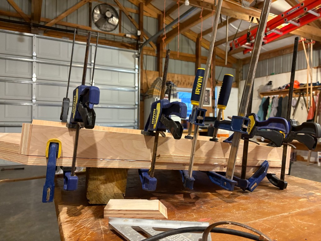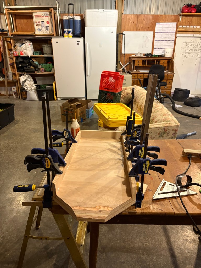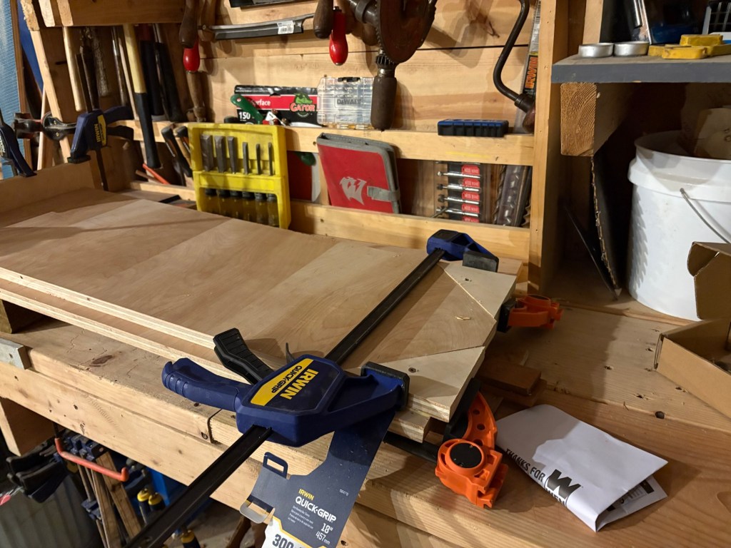 I was running out of time (you can see the daylight in this photo) so I used screws to draw in the side fences on the angled portions. Unfortunately, screwing into the end grain of plywood is not reliable, and two of the screws wouldn’t draw, so I had to rig up a clamp anyway, and it didn’t actually save any time. Lesson learned.