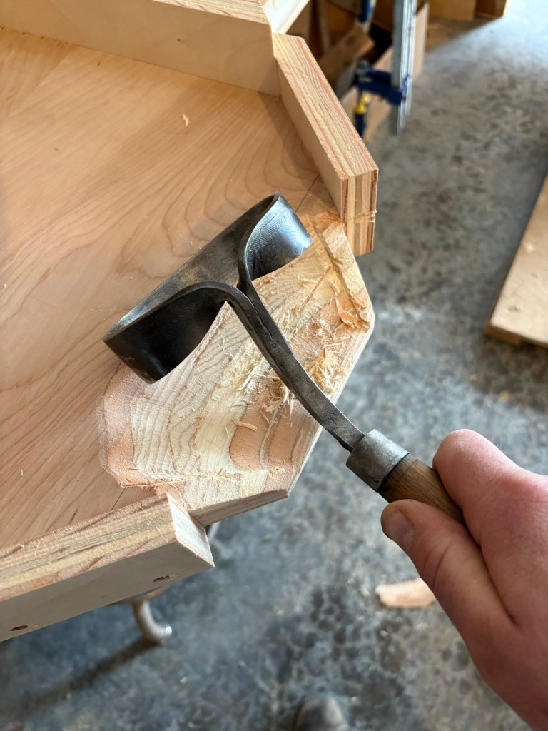 Later in the day, I cut out a run out channel. The scorp that Kathleen got me for father’s day was quite fast and efficient for the layers that it was going along the grain. Less so when going across the grain. It wasn’t designed for plywood, and I need to put some time into sharpening it.
