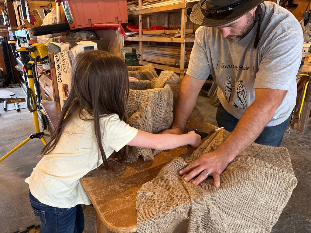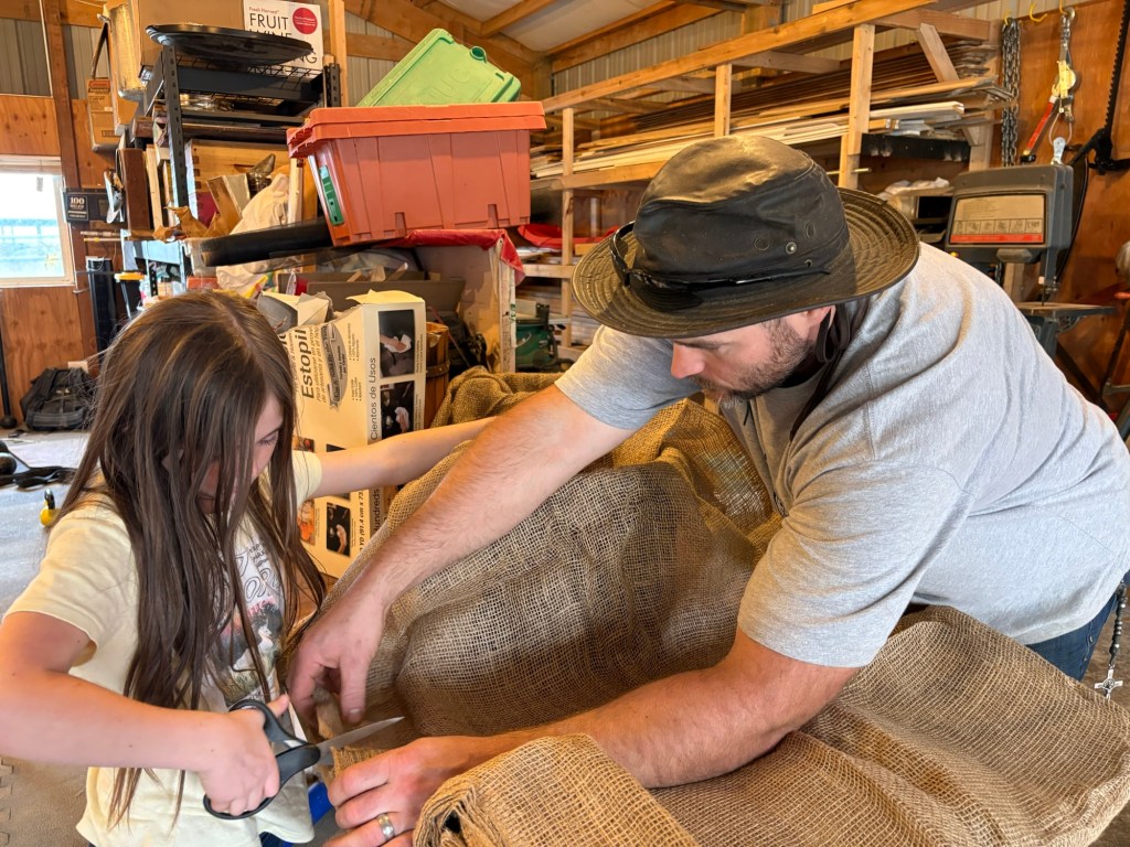 Cut the burlap to fit the barrels.
