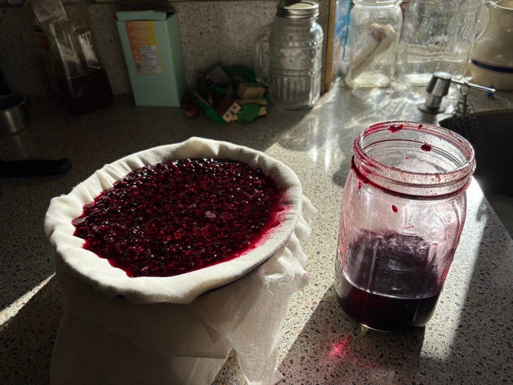 We also strained out our elderberry elixir. This is made with raw berries, gently mashed and then soaked in vodka with some spices.