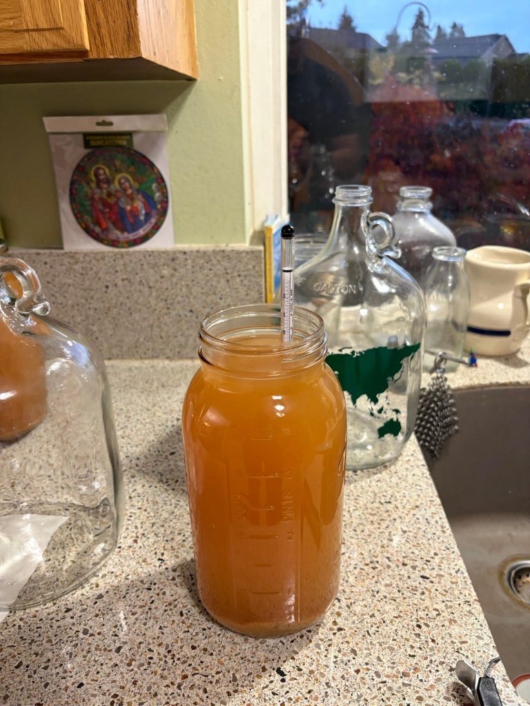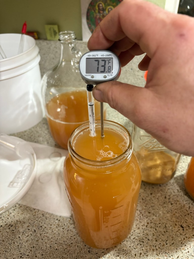 Then checked the specific gravity. This proved to be a challenge because the half-gallon jars are almost not deep enough for the hydrometer to float. It actually rests on the bottom of the jar.