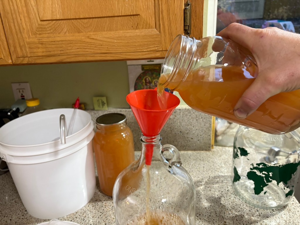 Our cider is 1.058, plenty of sugar, so time to pour it into the primary fermenter (Sterilized funnel and jug).
