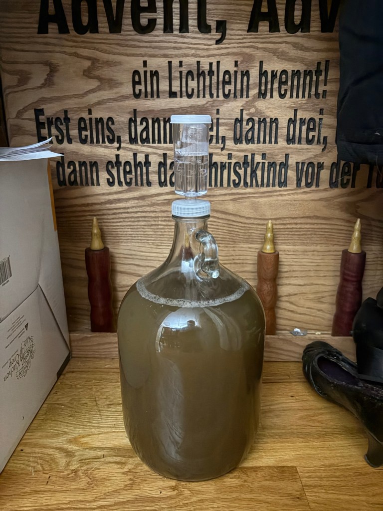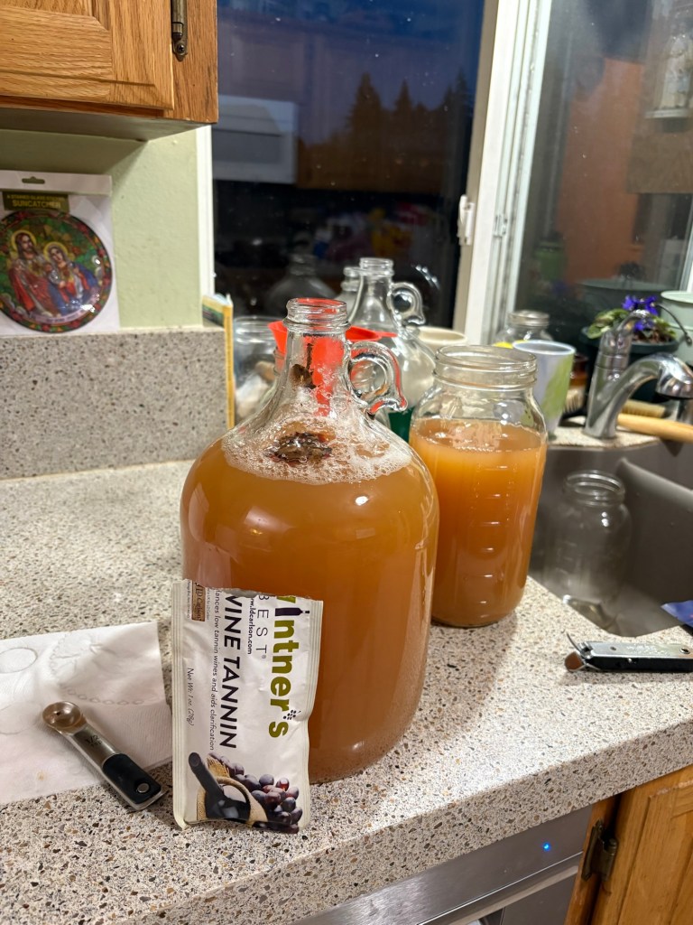 Our cider is made from sweet apples. This is not necessarily a bad thing, but most traditional hard ciders were made from apples that were not fit for eating directly. They were made from sour apples, like crab apples or green apples. This resulted in a complex, tangier final product. We can mimic that by adding tannins, and since I had some that came in the kit, I said why not.