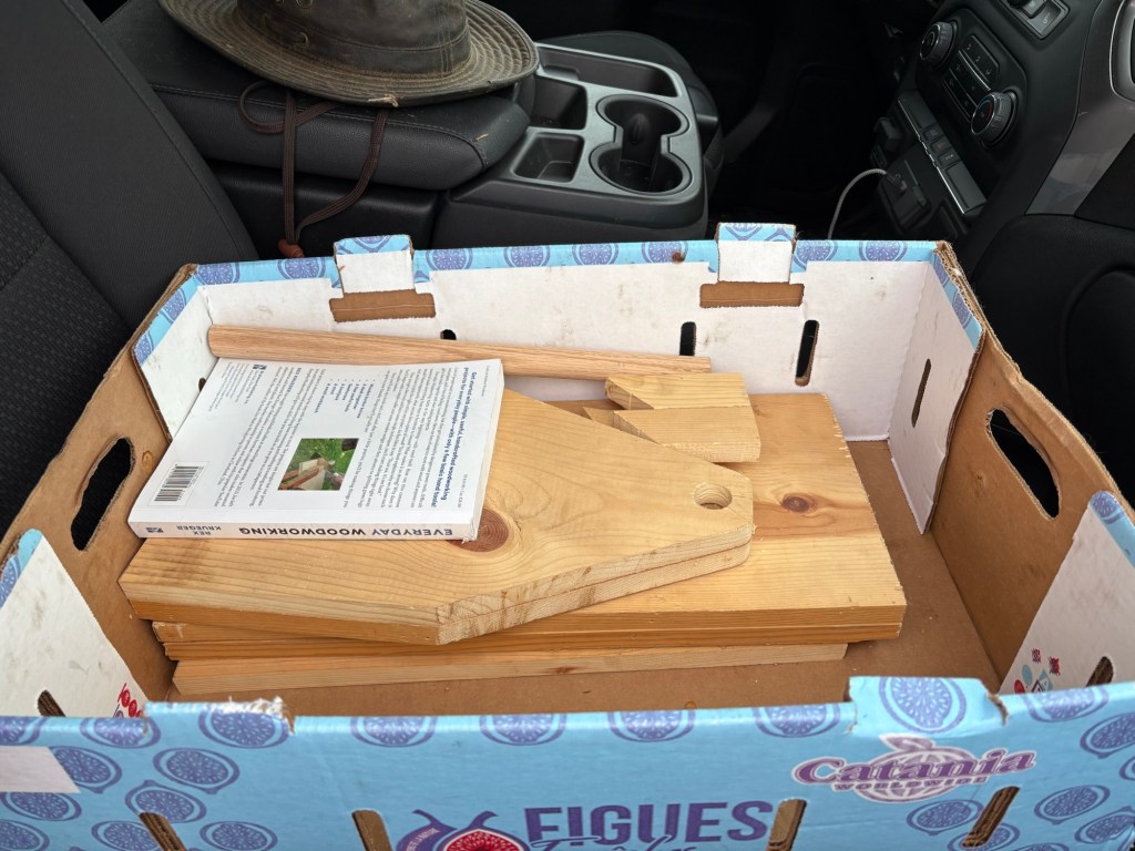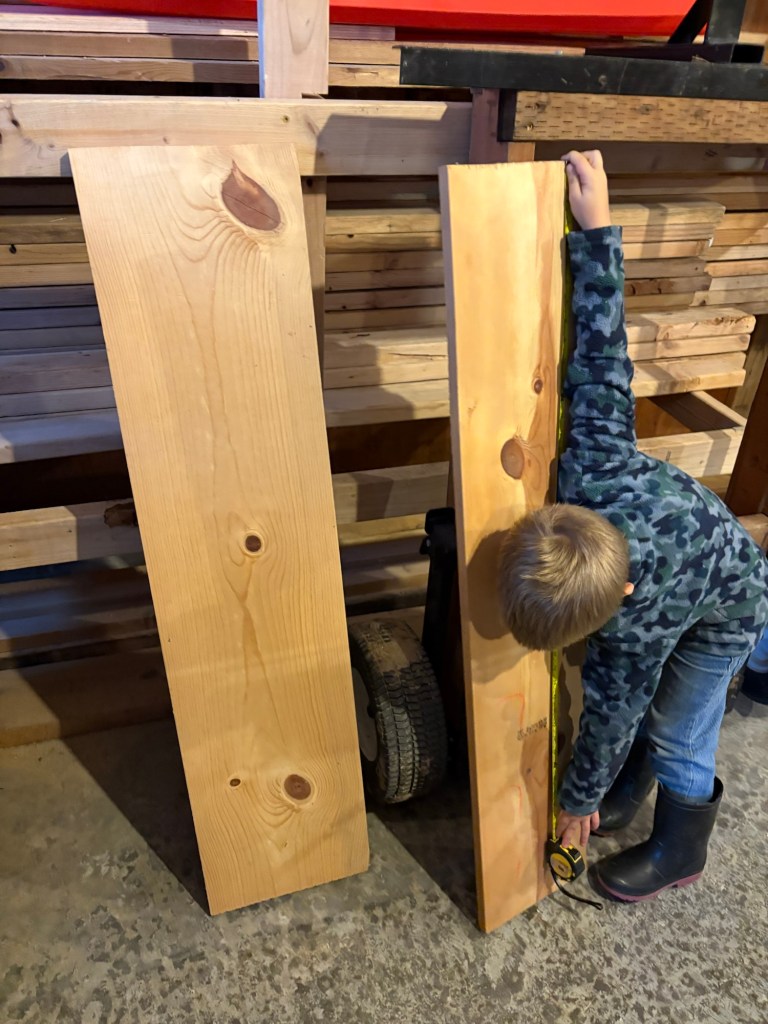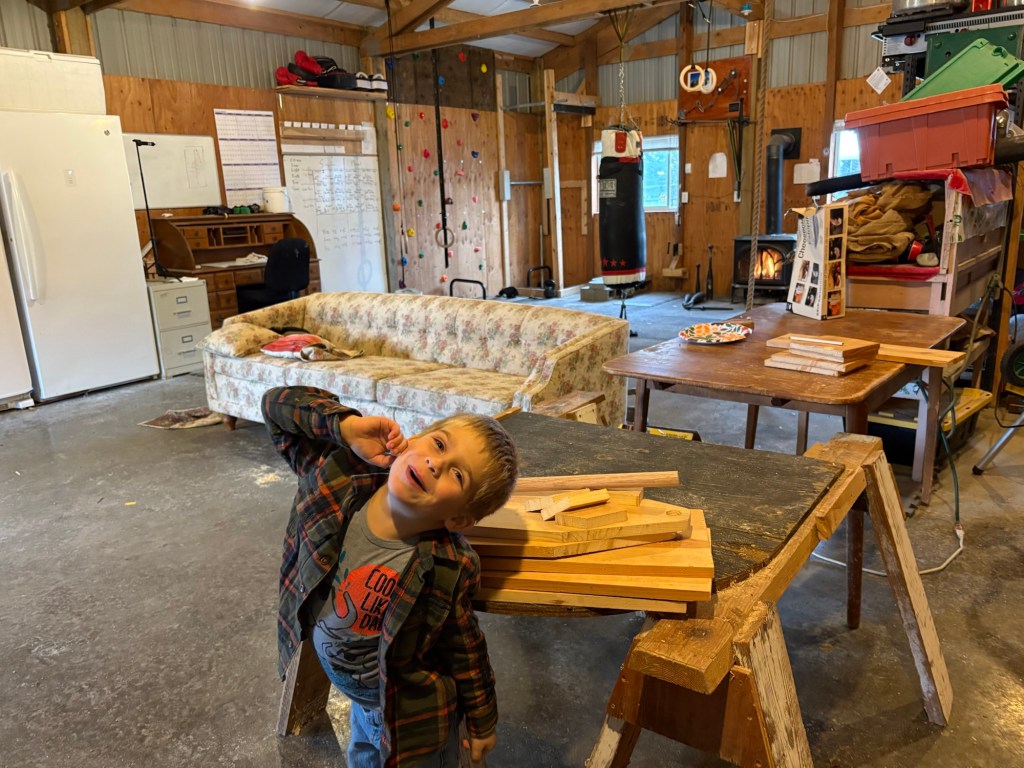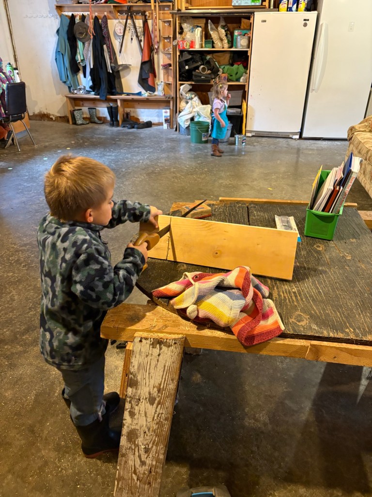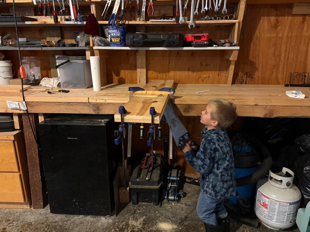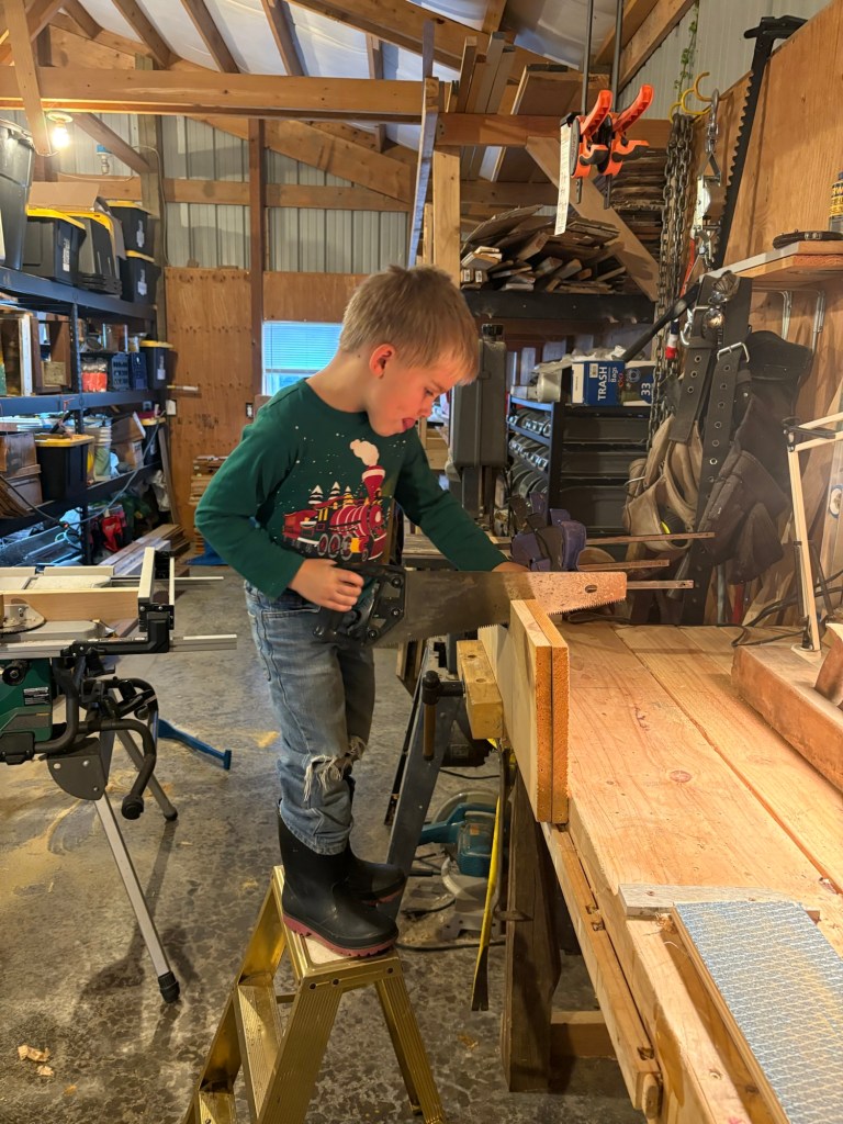 Recently we bought Seppi a new book called “Everyday Woodworking” by Youtube woodworker Rex Krueger. This is because he has been showing more and more interest in building stuff with wood. For example, last week when we got to the farm and started school, Daddy was too busy to help Seppi with his schoolwork for the first hour or so, so Seppi was in charge of his own education. He chose to educate himself on cutting wood with a hand saw.