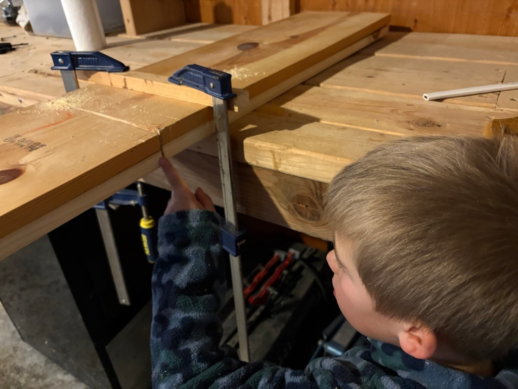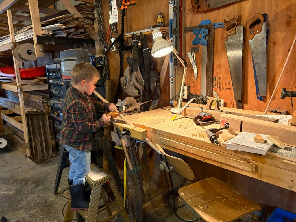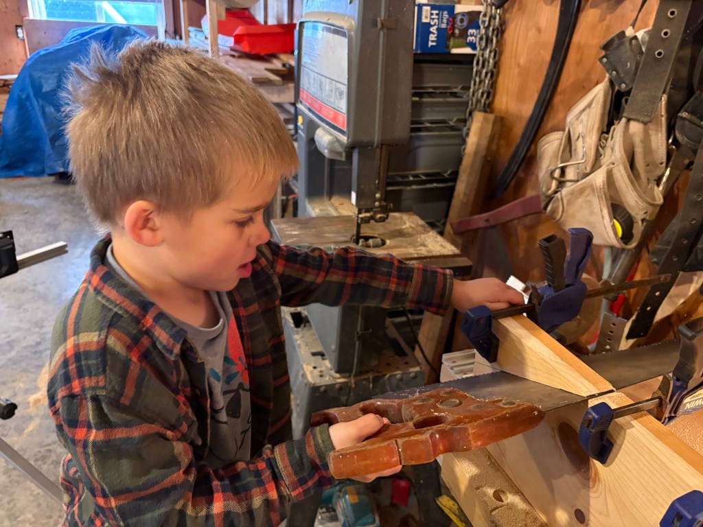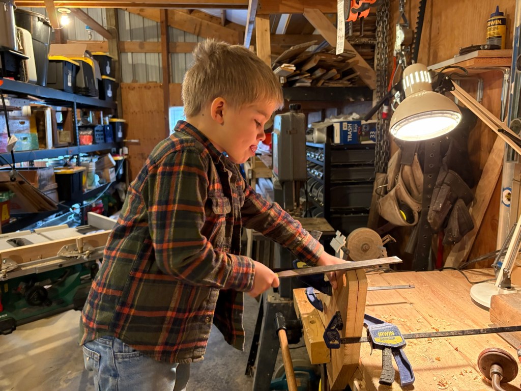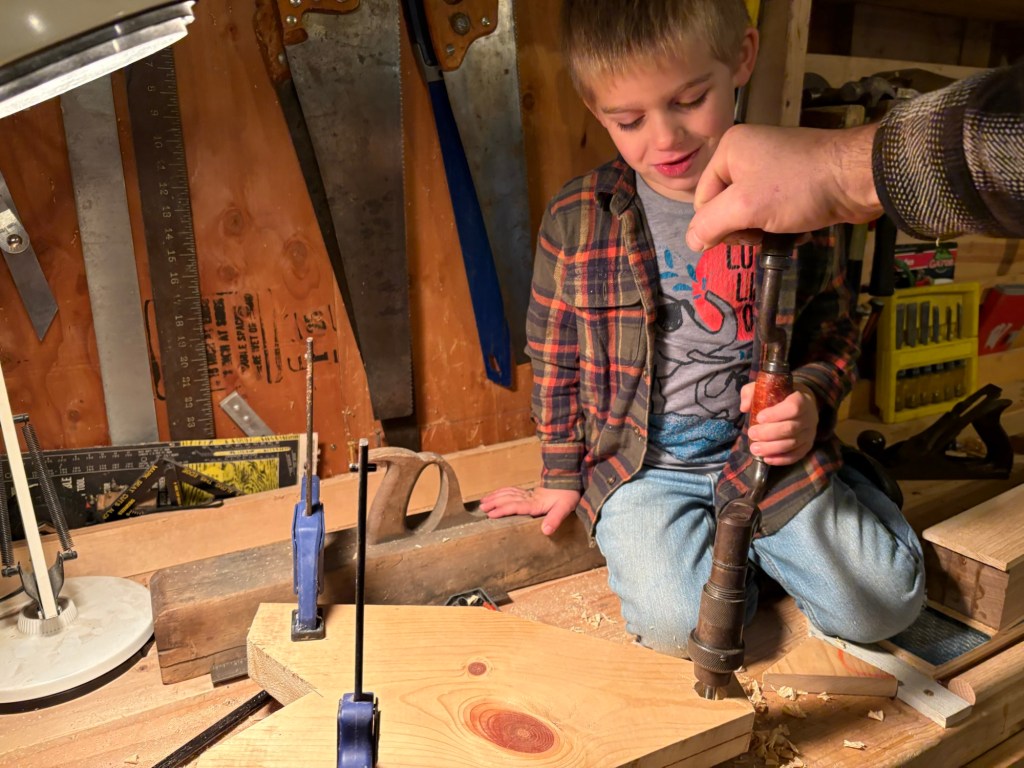 We could, of course, have busted out the dewalt for the handle holes, but a forstner bit in a bit-and-brace is surprisingly fast and effective. It was almost more than Seppi’s muscle could handle just yet, but he pushed through and got it done, and this makes him stronger, and helps him develop his eye and hand far more than me zipping through it with an electric drill would do.