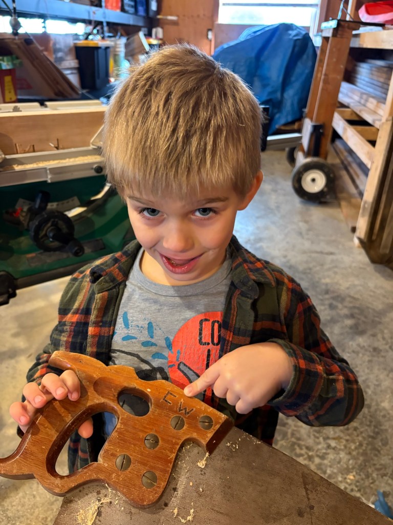 The best part is that this saw has the C. W. initials on it. This means is belonged to Papa Jerry’s dad, Grandpa Carl. Old as dirt, but still one of the best saws in the shop. These older saws are made of much softer and tougher steel, which, while not as sharp the modern contractor’s saw, can be resharpened and re-set, and even if necessary completely re-toothed in an ordinary workshop. With care, Seppi’s grandson’s could build things using this saw.