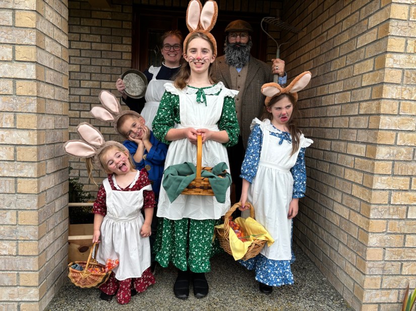 Flopsy, Mopsy, Cottontail, and Peter Rabbit (check out the blue jacket with brass buttons that Mommy made for her naughty little bunny). In the background you can see Mr. MacGregor, who chases bunnies with a rake, and Mrs. McGregor, who puts them in a pie.