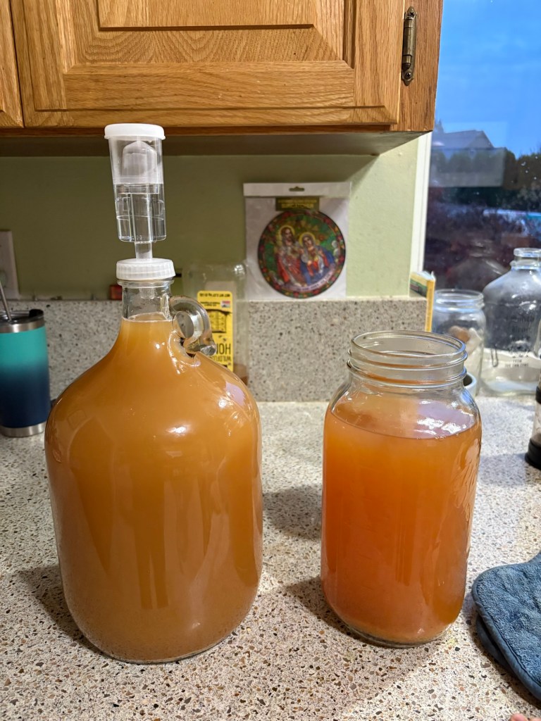 Since everything seemed to be going quite nicely, and the fluid levels seemed in no danger of rising, I sterilized the funnel again, and removed the air lock long enough to top up the jug. I also took the opportunity to draw some out with a sterilized 10cc medicine syringe and taste it. It was light, sweet, and fizzy, and did not taste very strong.