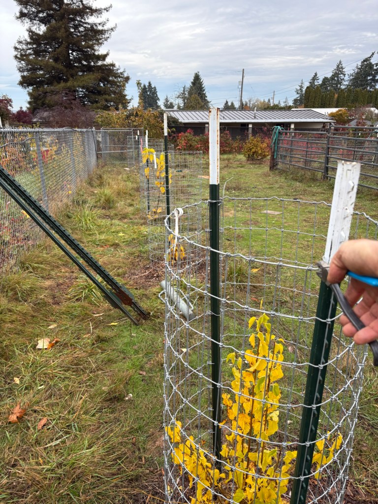 These protectors are a single length of left over woven wire fence, attached at one point to a t-post. This works well enough for the sheep, but not for the cows. Angus and Fergus thought these protectors made great scratching posts. Iris does too. This means that they shove their great, brawny sides against them and shove them off center so that they push right over top of the plants they are supposed to be protecting.