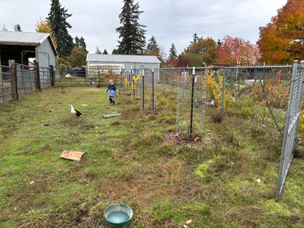 Before we let Iris and the sheep into the orchard, Seppi and Daddy spent part of Halloween morning reinforcing the plant protectors in the orchard.