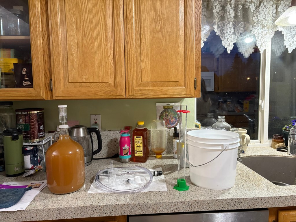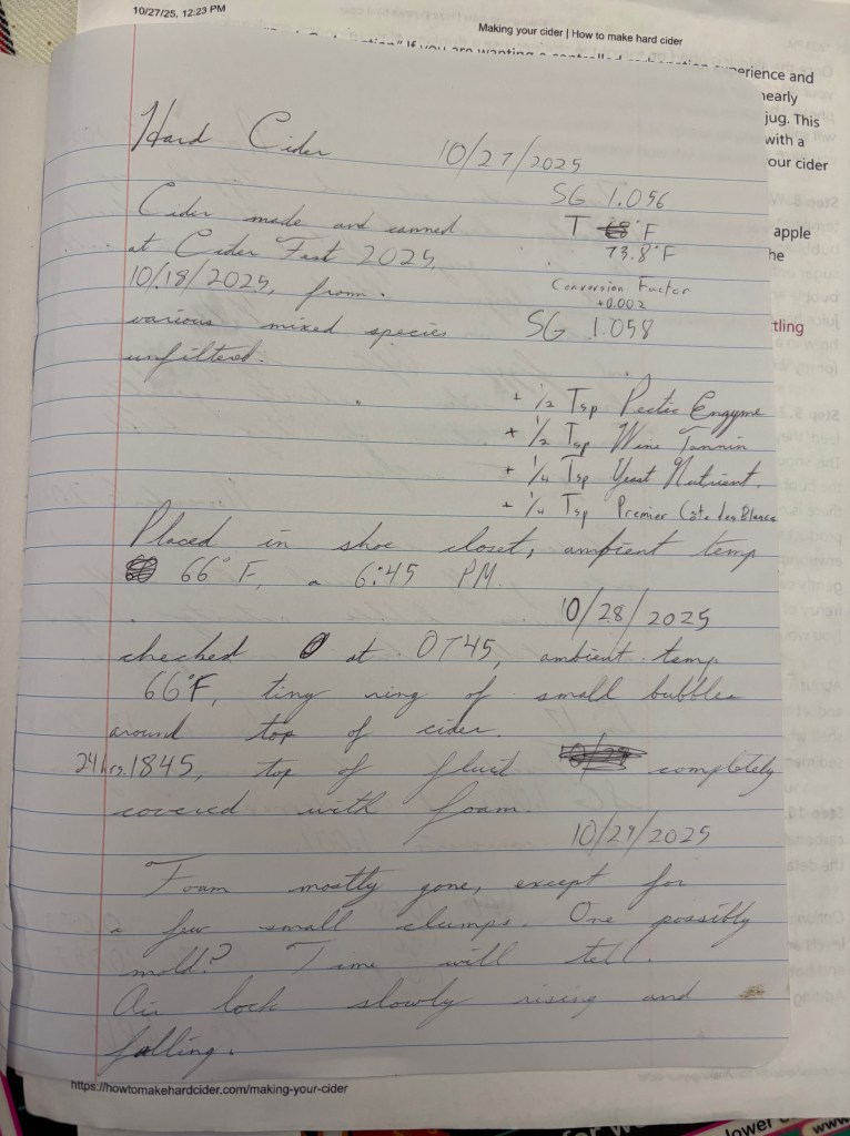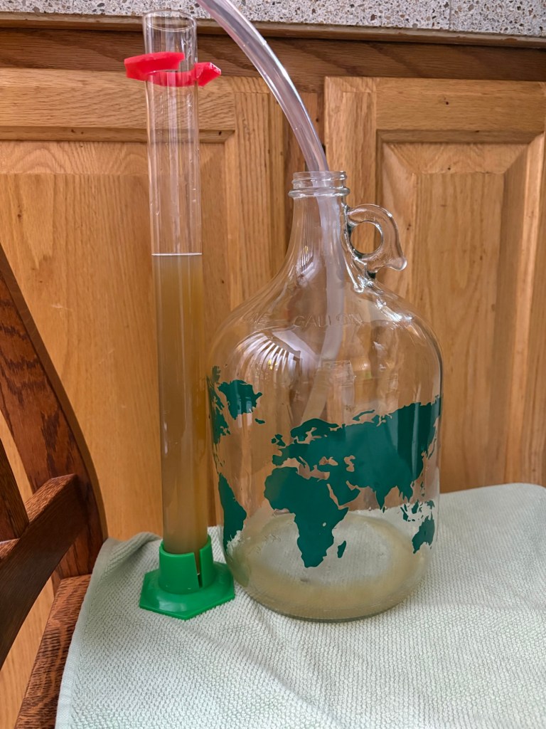 On the way back south after a National Guard day (long story) I stopped by our local home brew store and chatted with the owner for half-an-hour or so, learning what I could about hard cider brewing process. It turns out I have been doing it mostly right, and getting the rest right by accident. Among other things I learned that it is not recommended to let the cider “sit on the lees” for more than two weeks. That is, once the debris starts forming in the bottom of the jug (primarily the bodies of dead yeast cells), he recommends moving it to secondary fermentation to continue aging and to ferment out all the sugar.