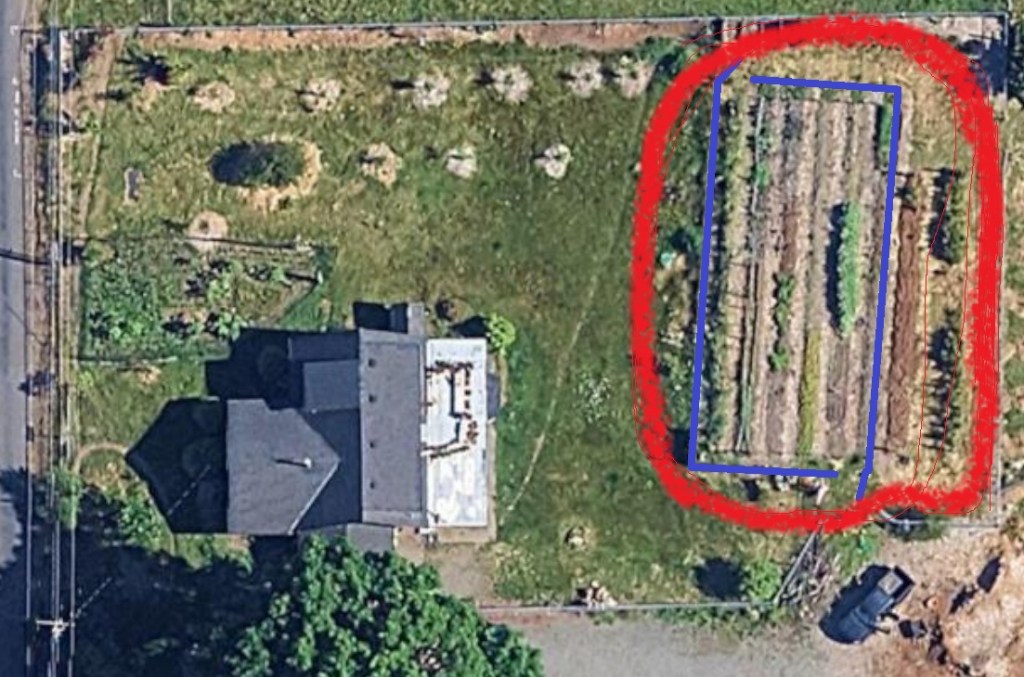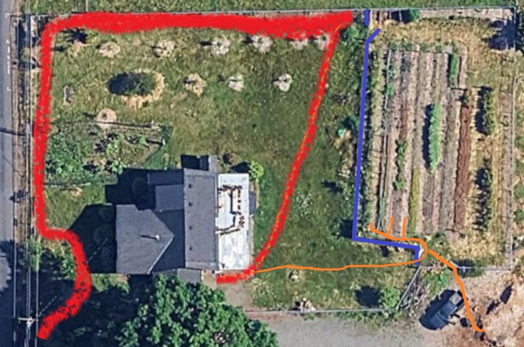 we made it a square fence (represented by blue lines on the picture above), with a gate at two corners, but we underestimated a couple of thing. First, we underestimated how much that dog would run around the garden to terrorize the livestock and trample on our new plants (represented by red on the picture above) That prompted our first re-routing of the garden fence.