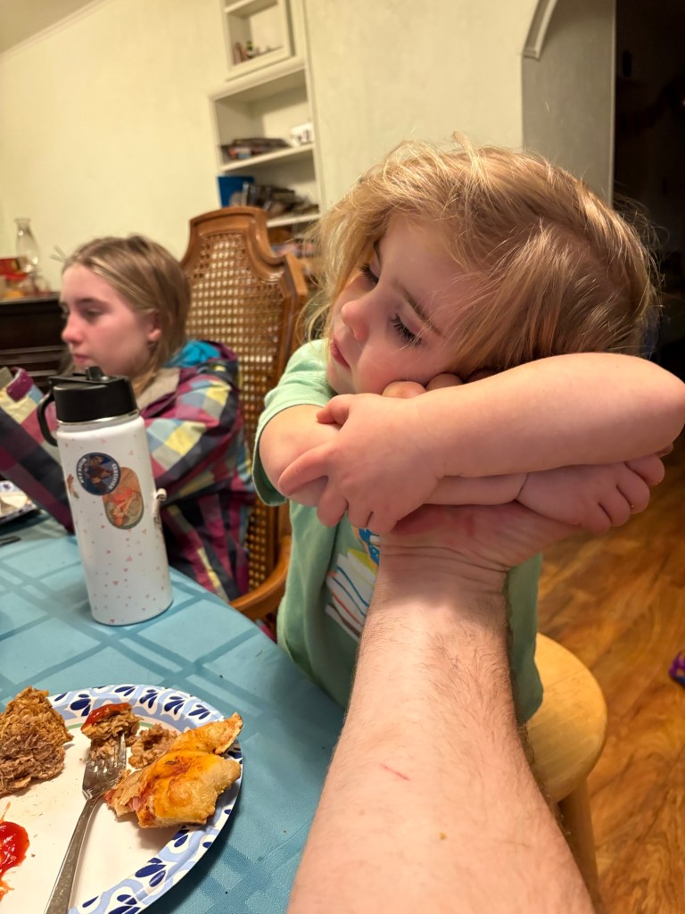 All that digging makes Winnie a tired Winnie. Fortunately, Daddy doesn’t need his right hand for anything at supper, so she can just pull it over and position it as her own private head rest.