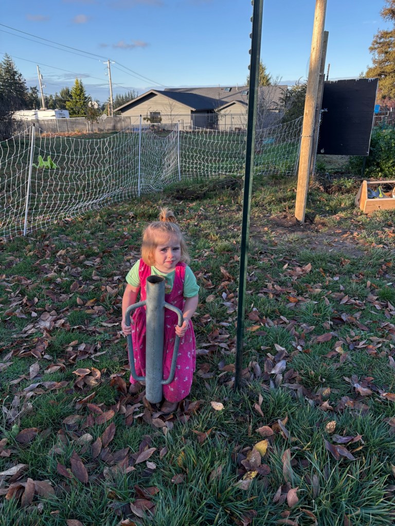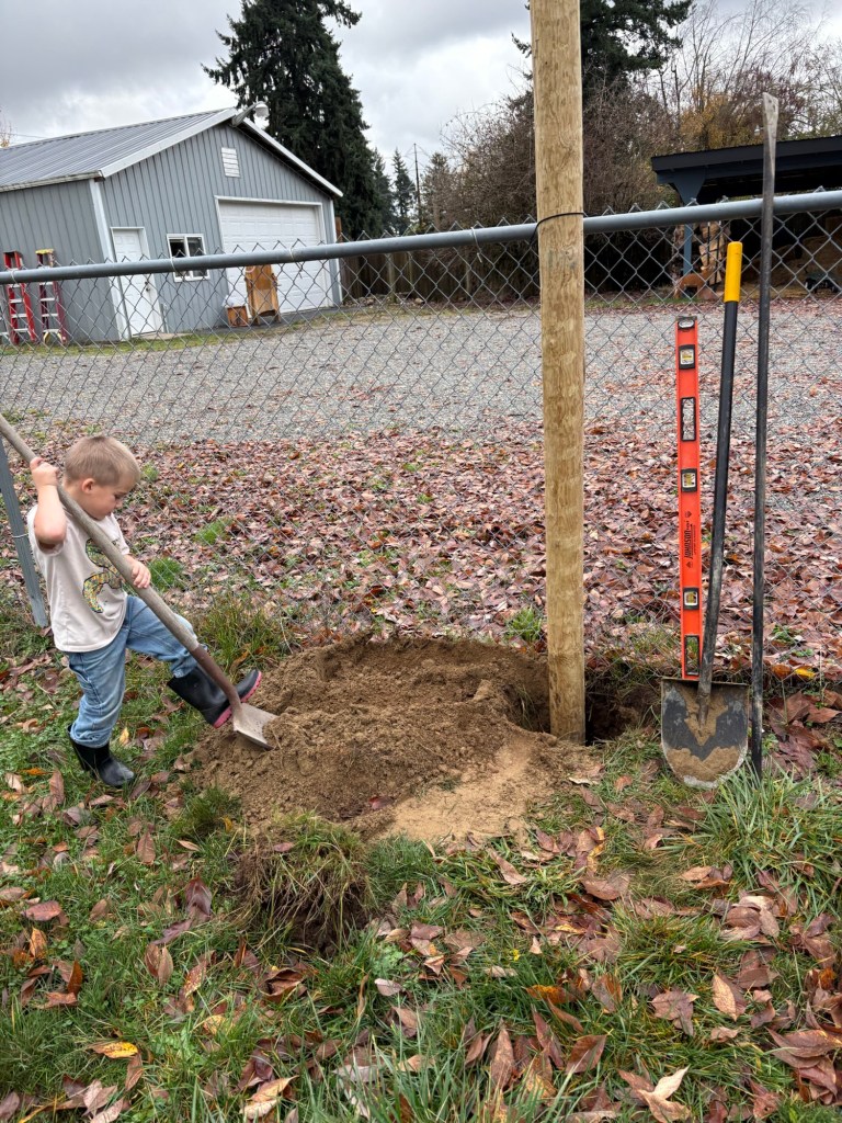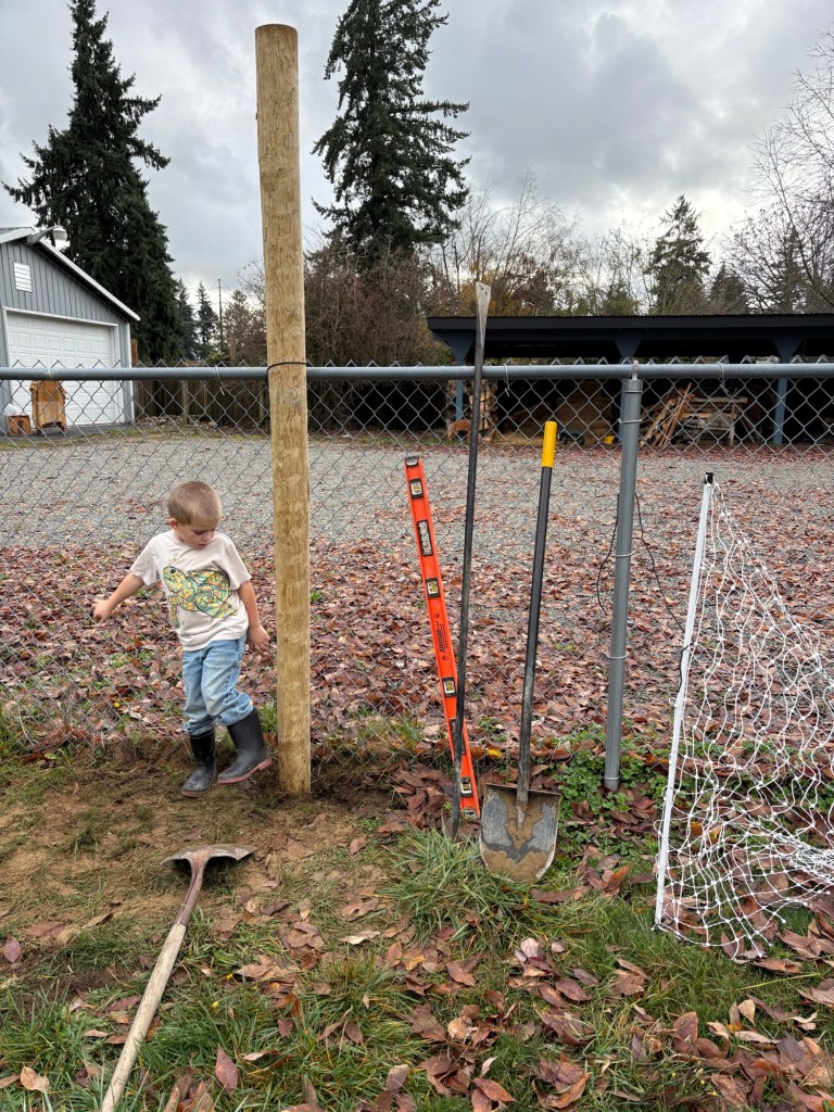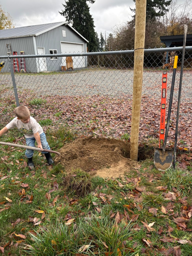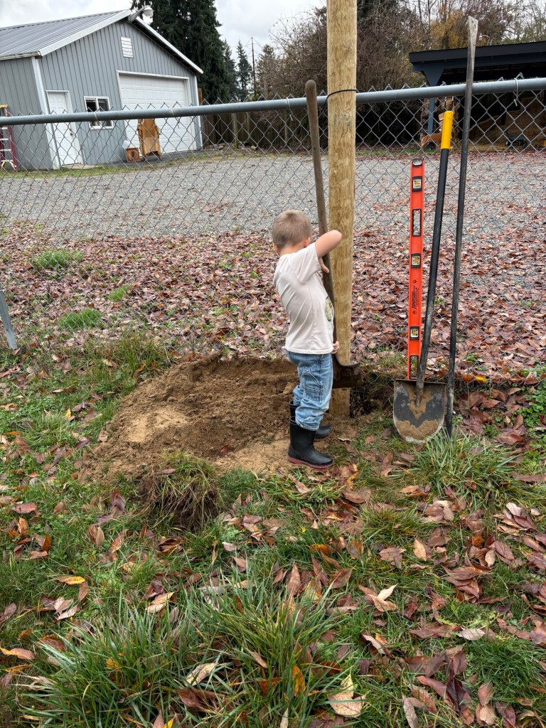 Seppi heard me pounding rocks around the bottom of the post and came running outside as fast as he could, outraged that I had dared to dig a hole without him.
