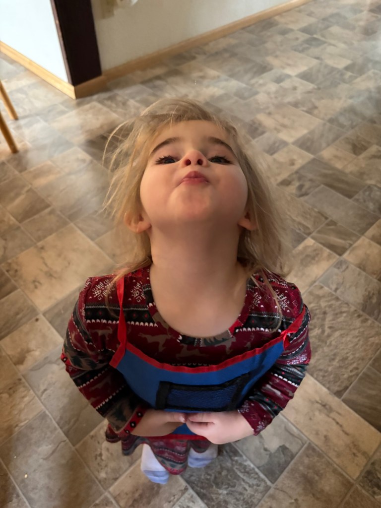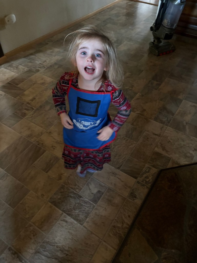 Good reason! (And no, it is not a video game that she “paused.” I am not sure what game she was playing, but the apron was a critical part of the game.)