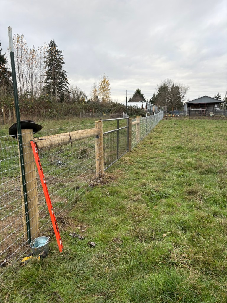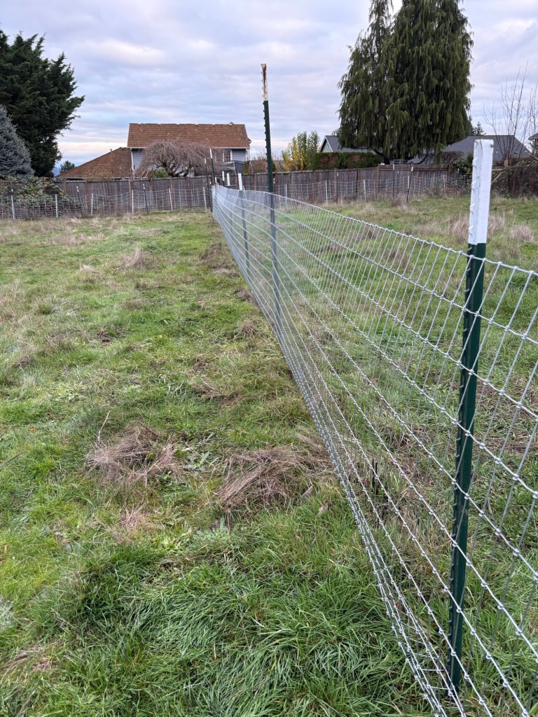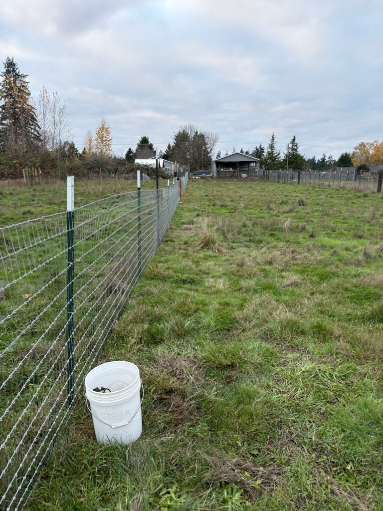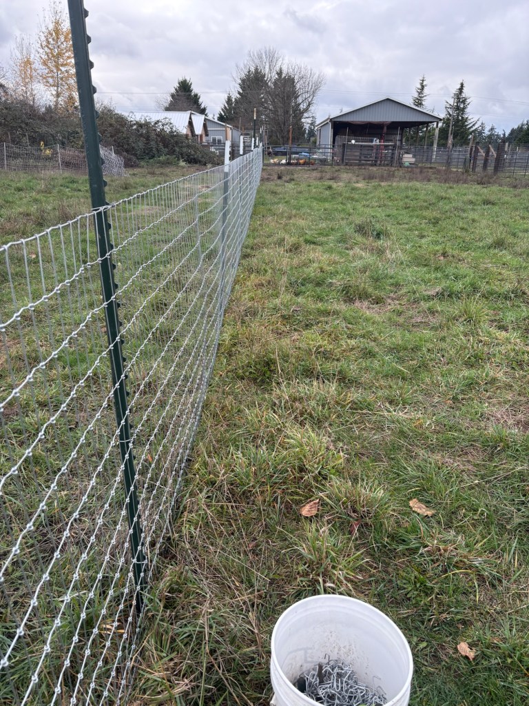 Trying to get brackets on the T-posts to help support the new fence. Without them, the fence hangs on its own weight which causes it to bow outwards in the middle, and will eventually stretch the wires unevenly. Started at 1:15 in the afternoon, because of peed bedding needing to run through the laundry first thing in the morning. Things have a way of snowballing around here. One delay leads to another, and next thing you know, you don’t get to that urgent task until after lunch.
