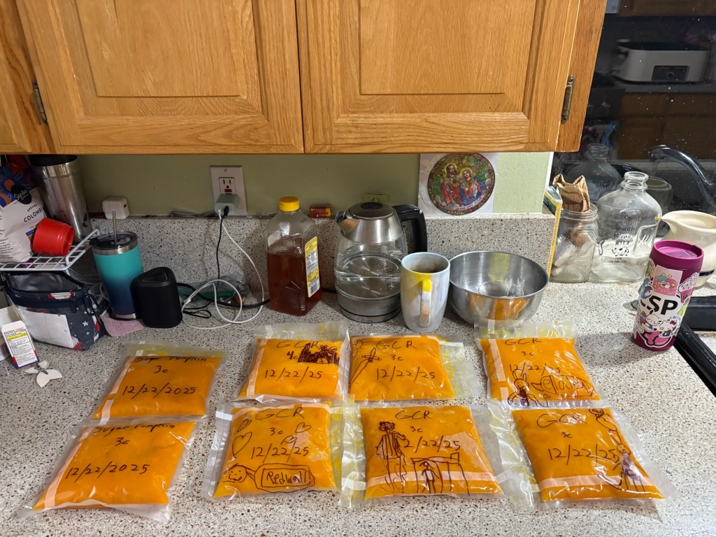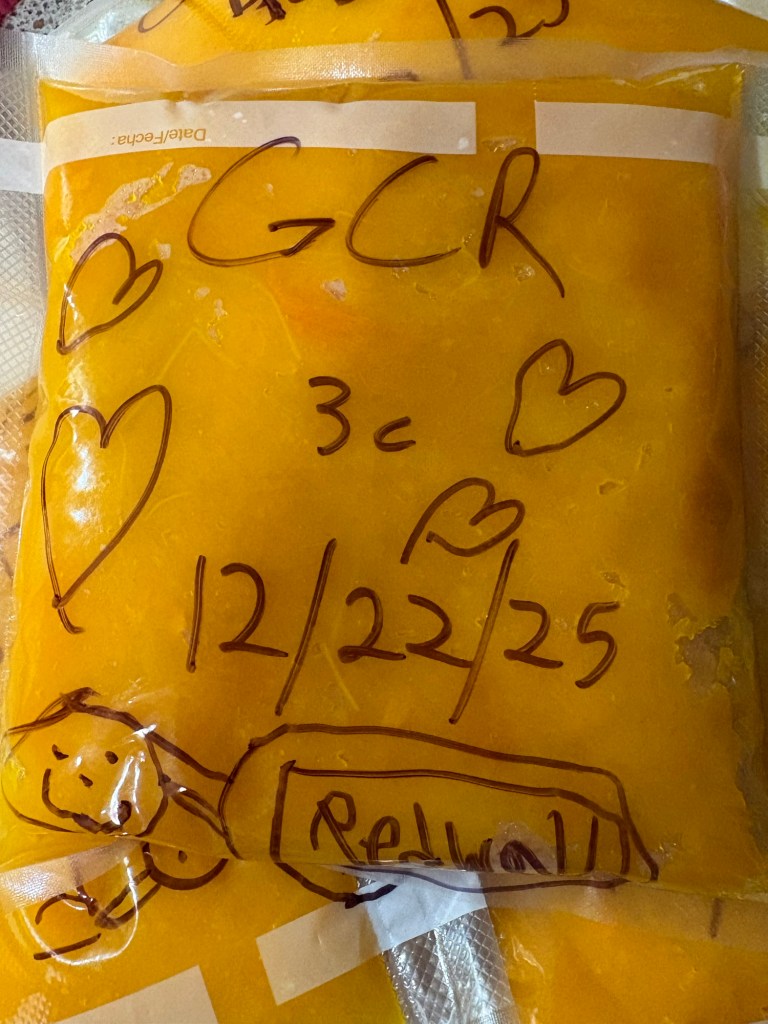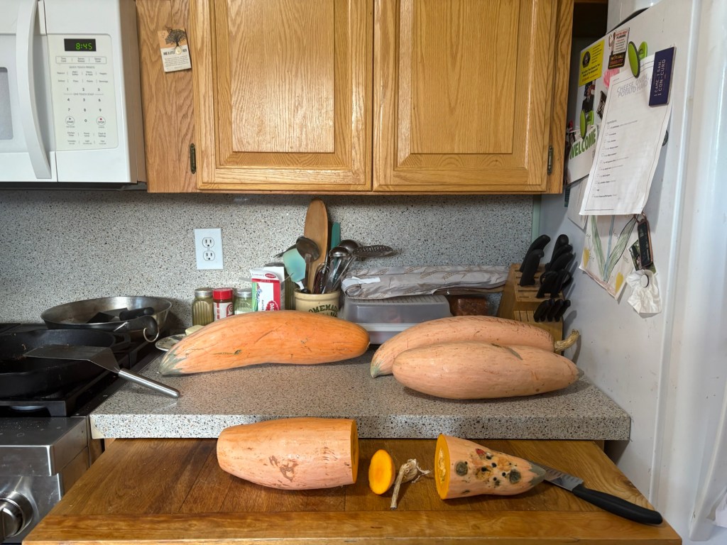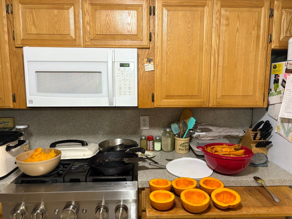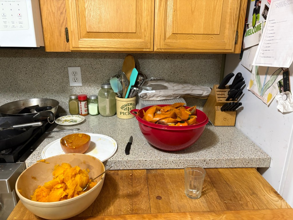Back to the house, continuing to steam the squash, a new batch every hour and a half or so.