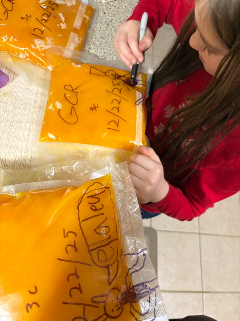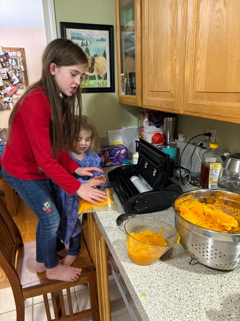When we get back from trips, there is always a cleanup and recovery period that takes a few days, sometimes longer. In this case, in addition to the usual chores that keep the house and farm running, and the schooling, we also ran into an issue that cost us most of our pumpkin and some of our squash. We store the squash on the back porch, where the temperature is cool, but usually not too cool, and the humidity is high, but usually not too high. But in the week of the flooding, with the combination of a hard frost, and then several days of continuous dampness, most of our sugar pumpkins ended up molding, and had to be fed to the pigs. The Georgia candy roaster squashes were also starting to show some spots. So bright and early Monday morning we pulled the remaining squashes and pumpkins inside and began to process them.