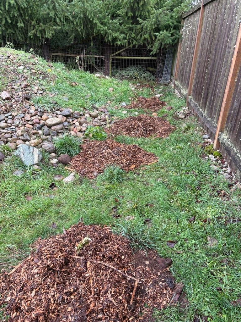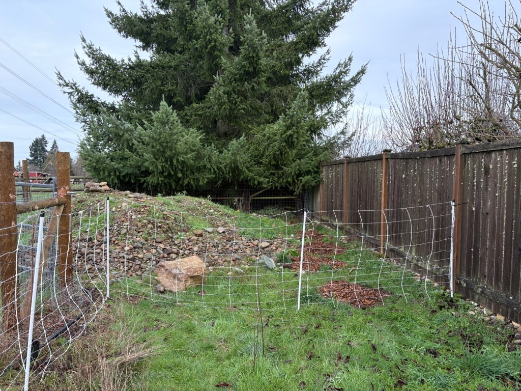 The bayberry is known for growing and thriving in poor, salty or acidic soil, so we stuck them around the rock pile under the pine trees. We will need to run irrigation to them before the summertime hits.