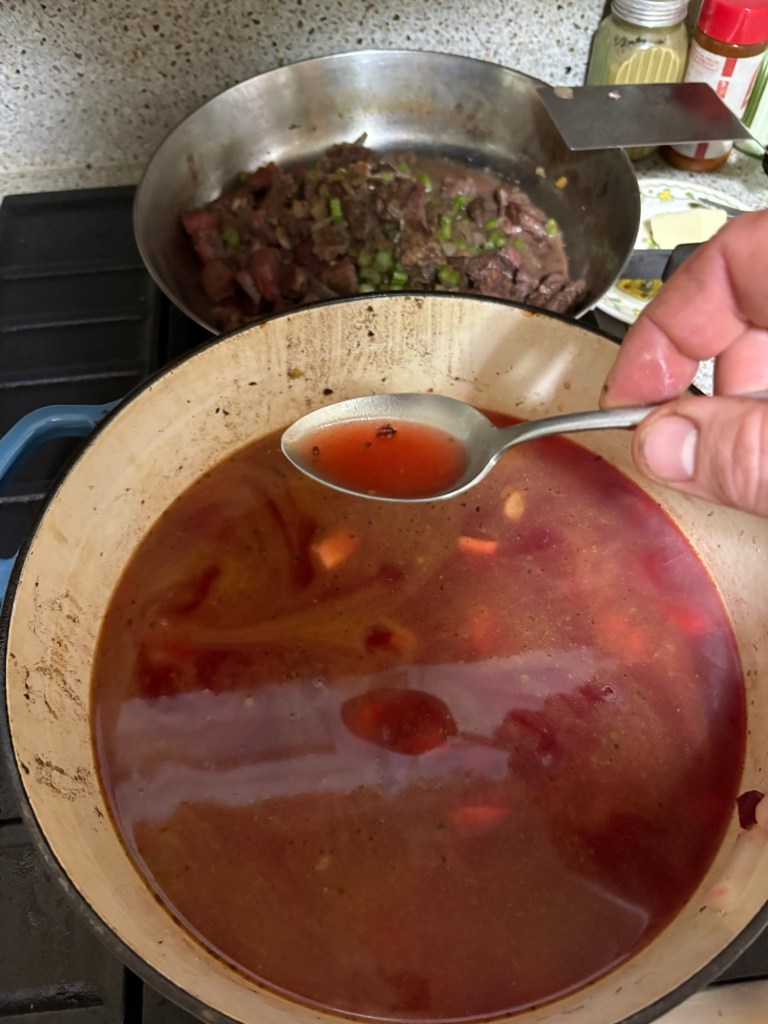 Broth from oxtail and beef heart, with a little juice from the beets to give it a red color.