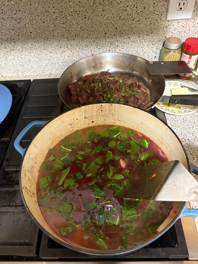 Last thing before you throw the seared beef back in, toss in a couple of diced brussels sprout leaves.