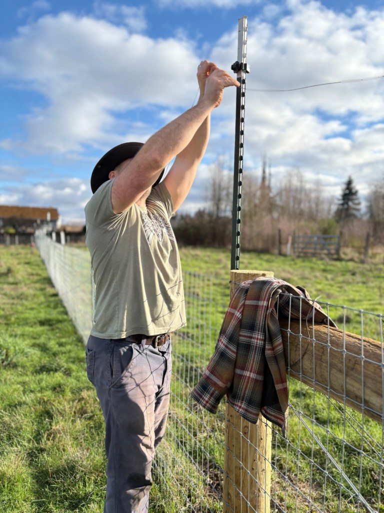 Back at the east end of the field setting up the latch that will connect to the hot wire from the shop.