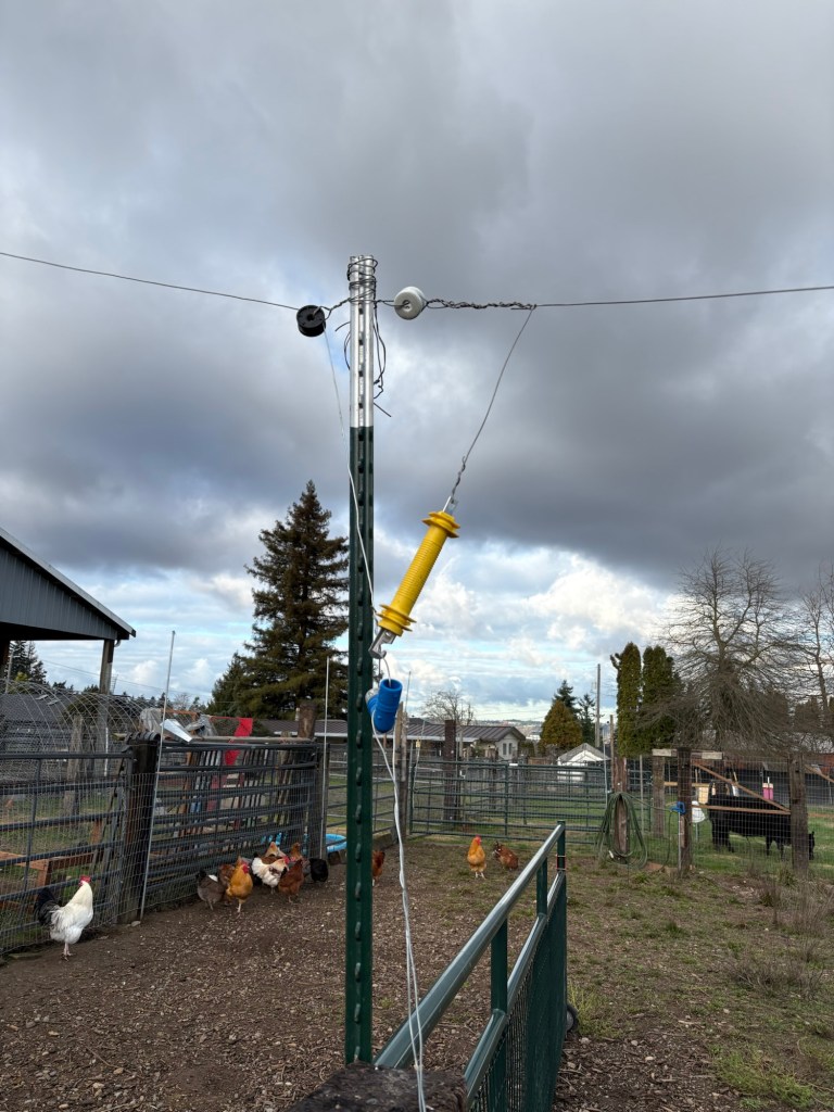 This was a little tricky because the gate latch is attached to a T-post which can angle slightly back and forth. We want to have the electricity running on a high line that will keep it about 6 1/2 feet off the ground. This will put some tension on the top of that T-post and pull it in towards the gate. This will pull the latch into the gate and prevent it from opening. We fixed that by running a guy line from the top of the T-post to one of the cedar posts holding up the neighbor’s fence.