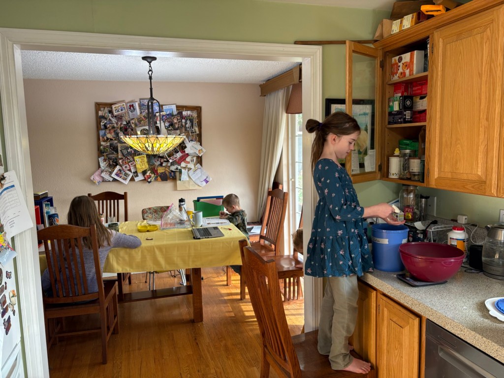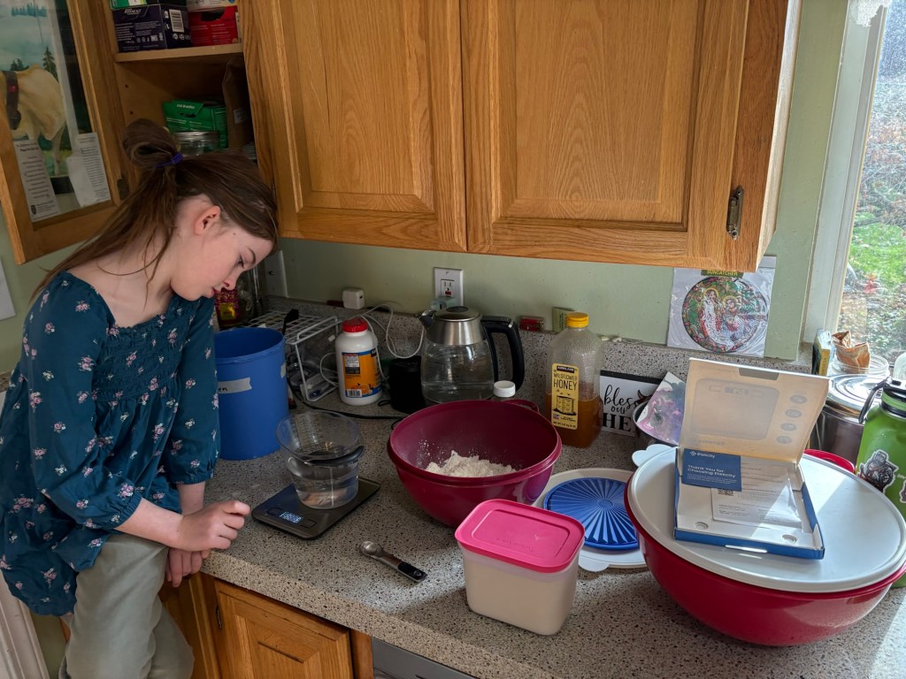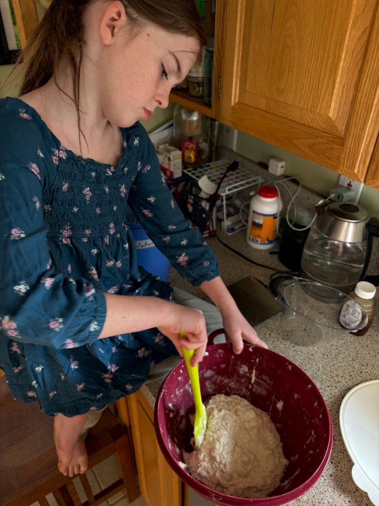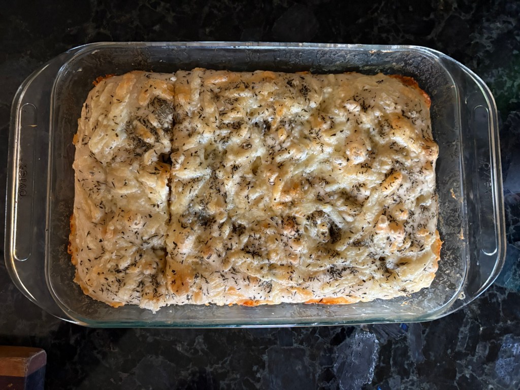We took the dough out of the oven and let it warm up on the countertop for an hour and a half. Honestly, I would have liked to let it warm up for another two hours, but that is all the time we had. We had to bake it at Uncle’s house, because our oven is still down and the counter top oven won’t fit a 9×13.