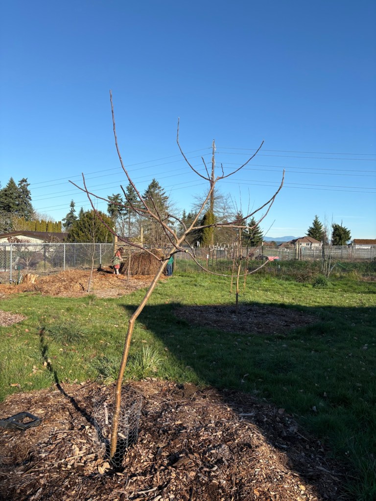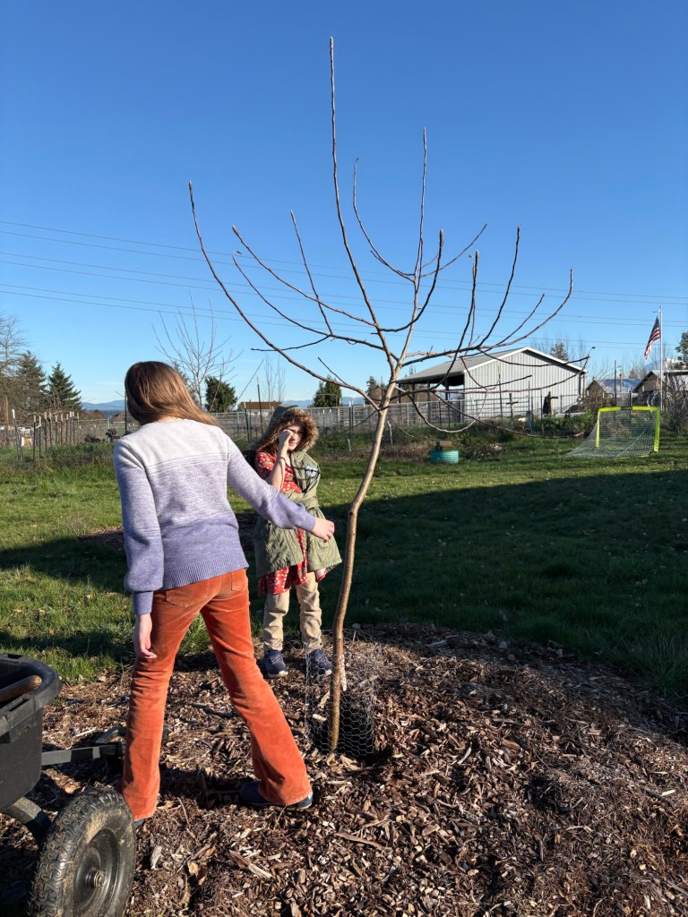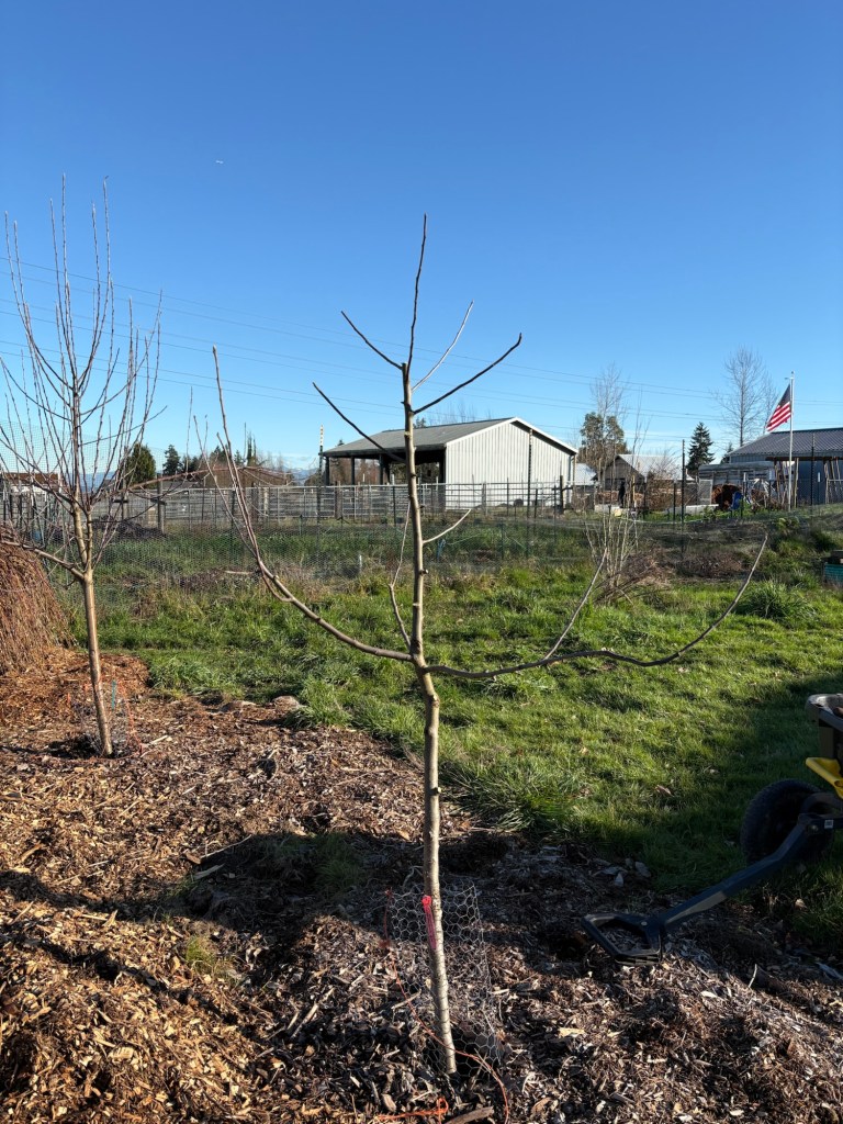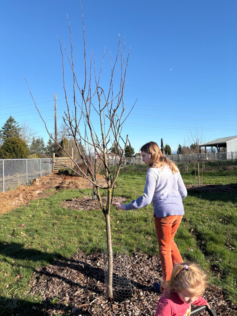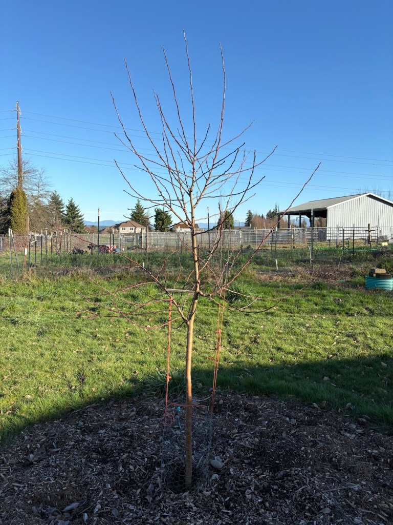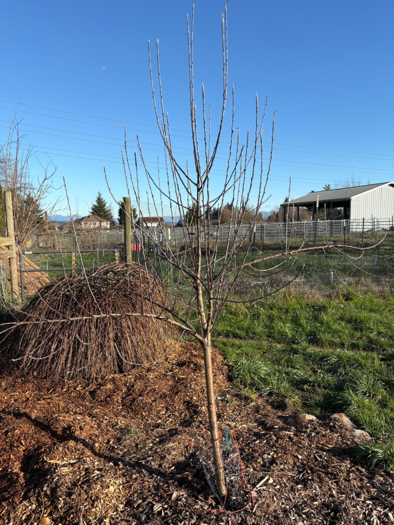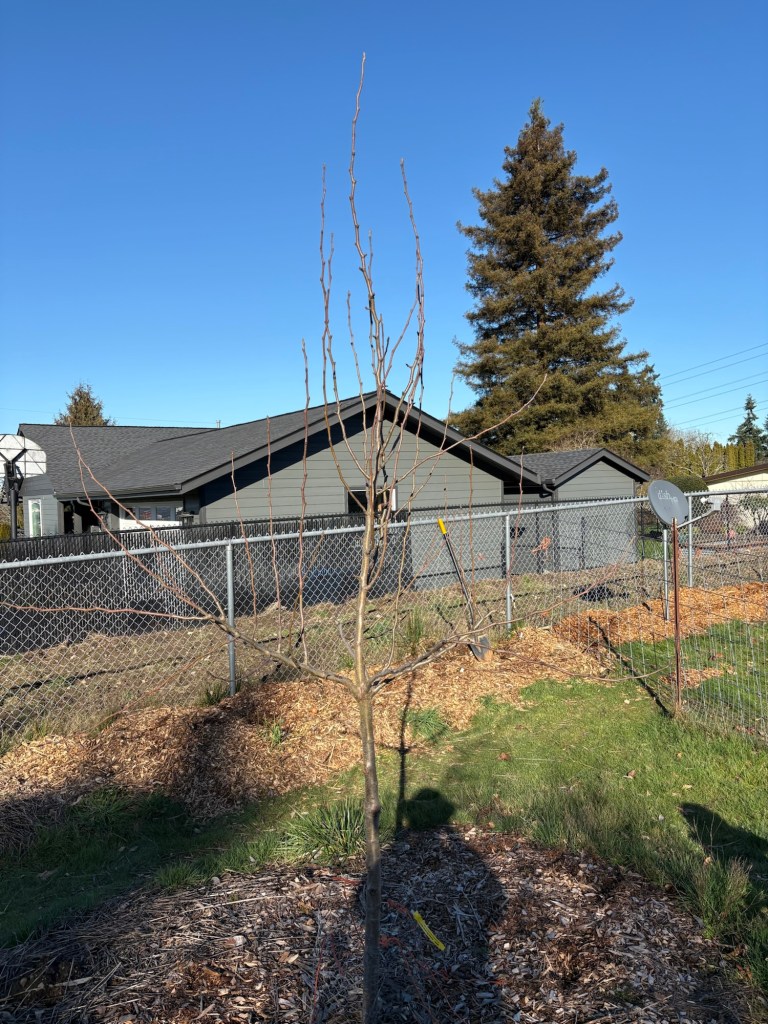 The Wolf River is more than tall enough. We don’t want the apple trees to get above 8 feet tall, so that we will be able to pick them without a ladder when we are old. This one has a funky southward bend mid trunk, so…