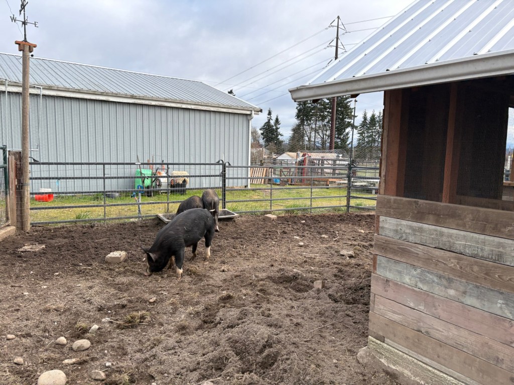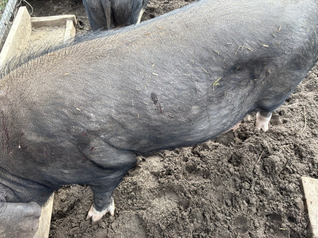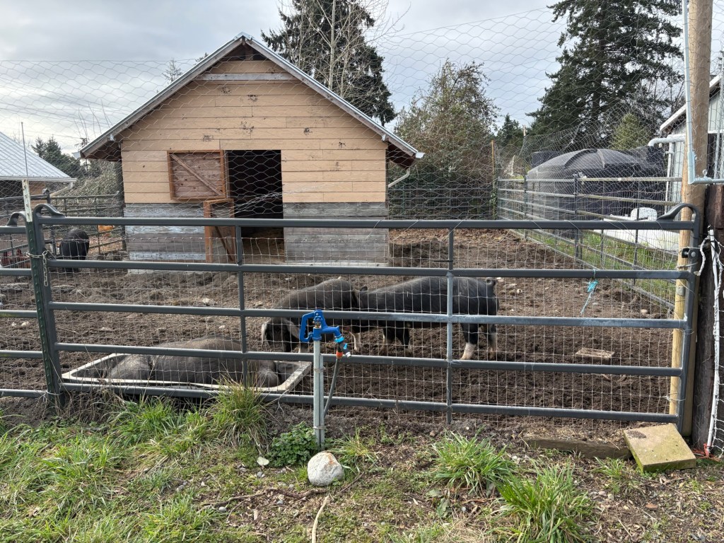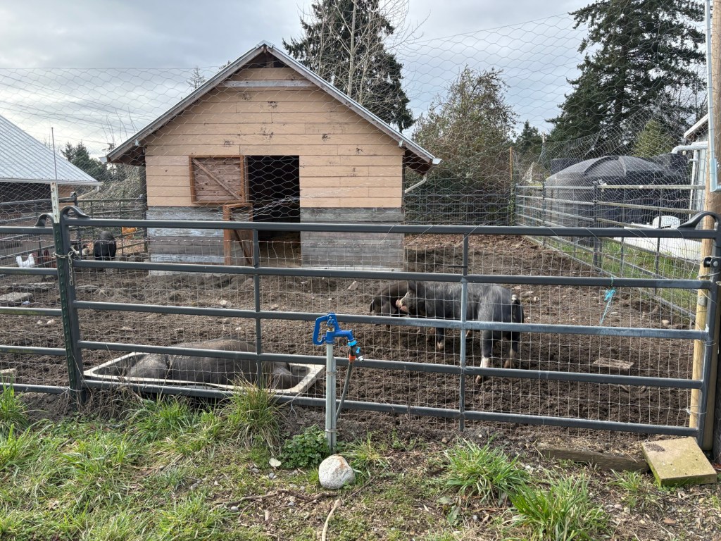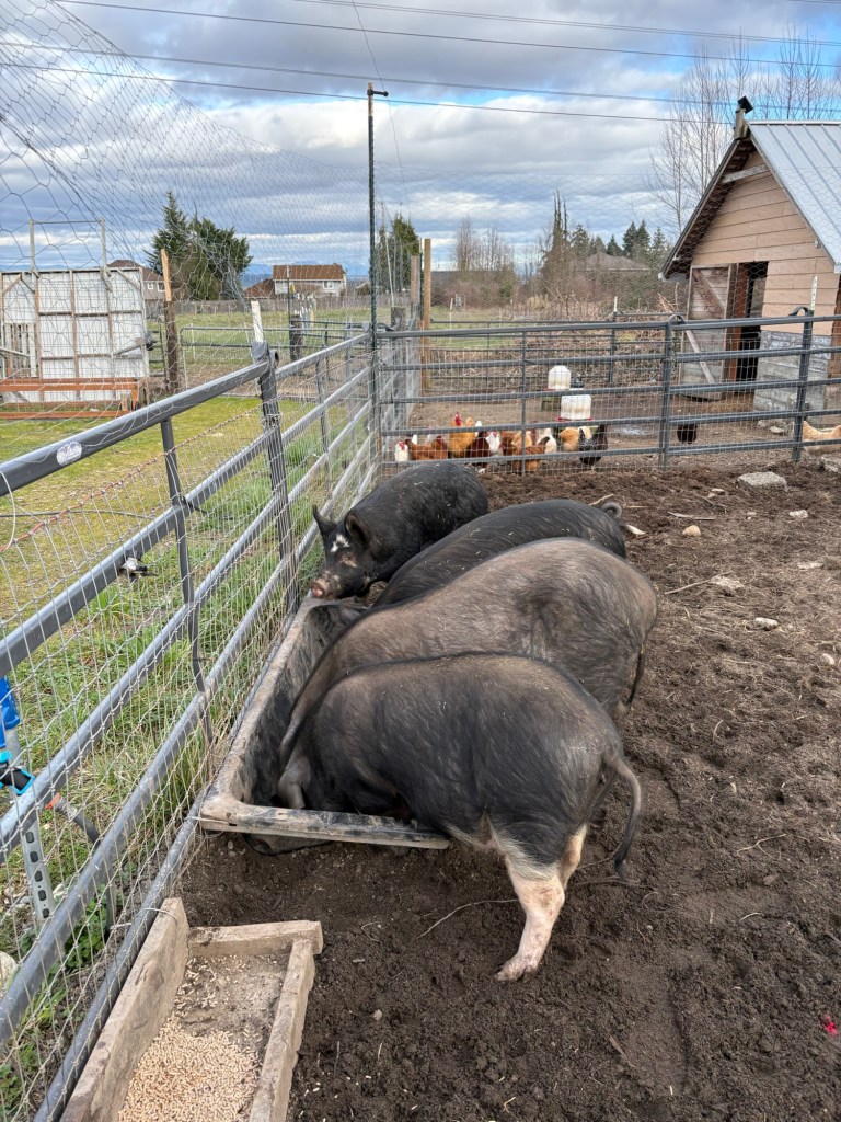 Newly established hierarchy. We don’t like the berkshires as much as the Meishans. The Meishans are much friendlier and more docile pig, but I wouldn’t want to turn my back on the Berkshires if they were really hungry.