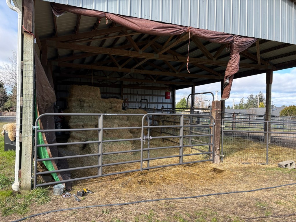 The second project was a quick one, just installing a pair of gates on the end of the barn so when the cows and sheep are in the yard around the barn, they are not eating all the alfalfa.