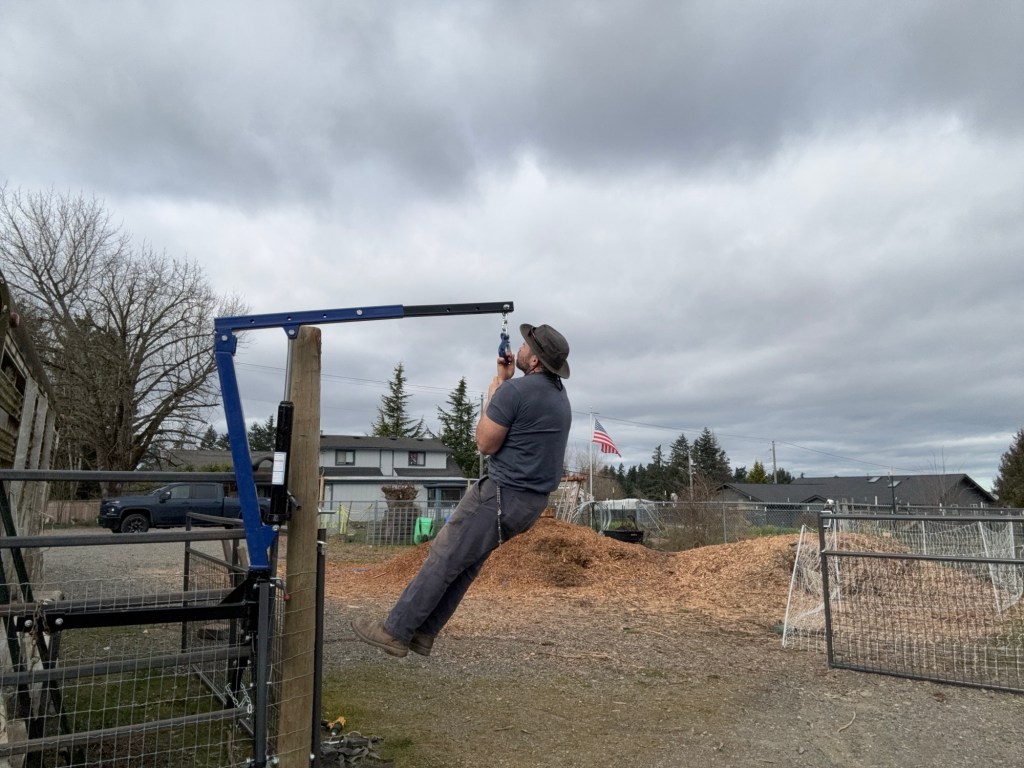 Then I installed the hydraulic hoist. To slaughter the last sheep I had it attached to the hitch of the pickup truck, which is what it is designed for, but I did not like how unstable that was, and wanted the option for a few feet more height. So I figured out a way to mount it to the fence panel behind the shop, conveniently close to the pig pen and the barn. Seems sturdy enough to lift anything we are likely to butcher.