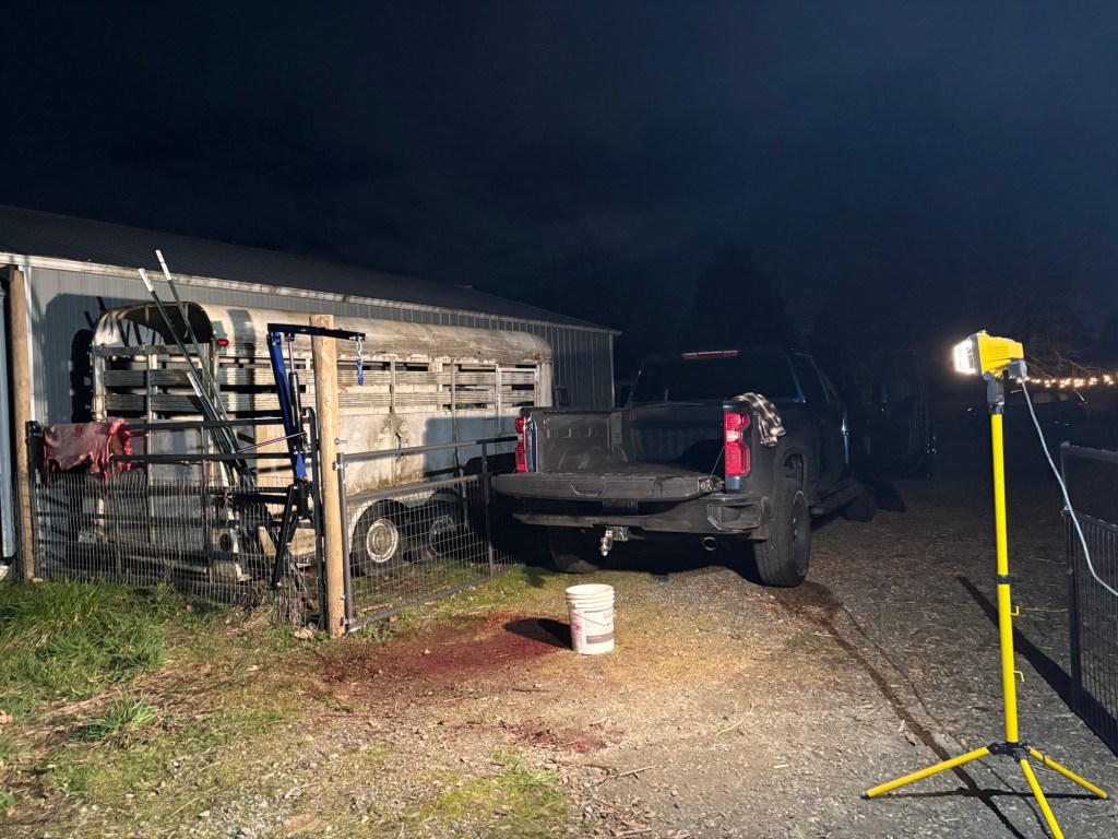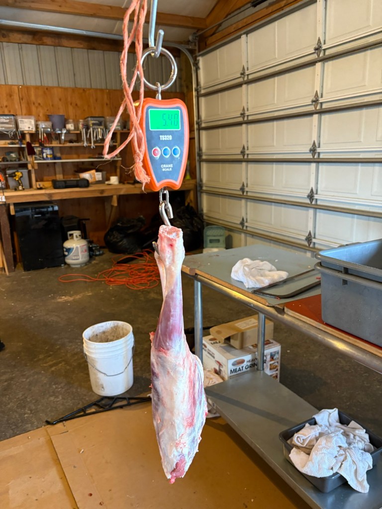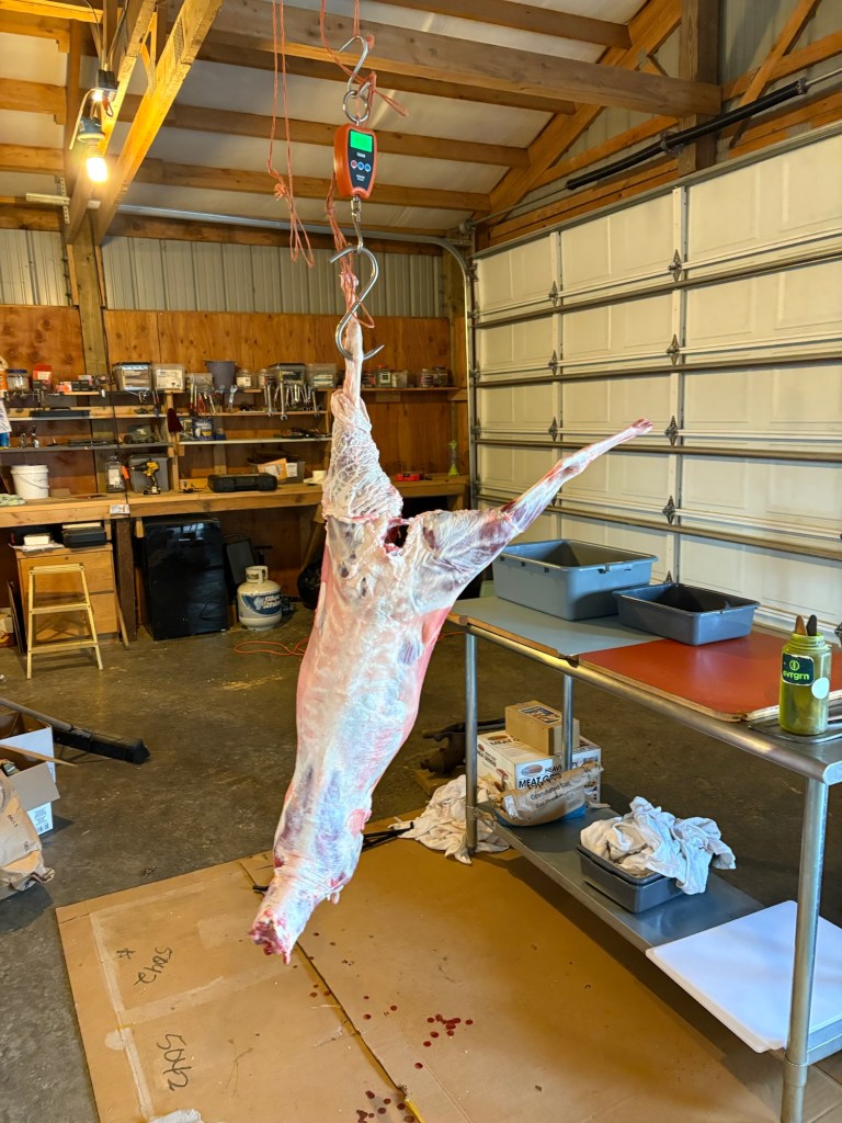 The new setup worked great. I started late, it was chilly but not too cold, and I knew from the start it was going to be a long night. I had just re-watched the Pasture to Plate Home Butchery class from Brandon Sheard on School of Traditional Skills, and I tightened up all my techniques, following as closely as possible. The dark actually helped because I couldn’t see everything so I had to proceed more slowly and methodically feeling my way through the fascia planes. The result was a very clean carcass with the fells almost completely intact, all the subcutaneous fat intact, and a very clean hide. If we were in a position to tan it, it would hardly need any scraping at this point. Of course it also took two hours. Brandon makes it look so easy.