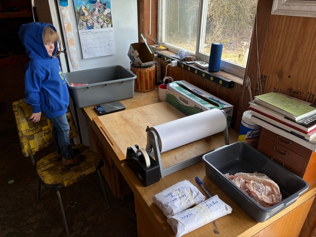The butchering the following day went much more smoothly as well. It was complicated by my oldest helper having to go to the Sewing and Stitchery expo…