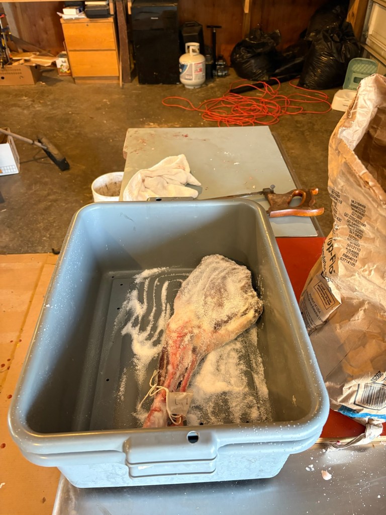 Last week’s leg of fenalar had to be rinsed and salted again. It was now 4 Lbs 4 oz, down 8 oz from a week ago. We will leave it in the salt dredge another week and then hang it up to cure.