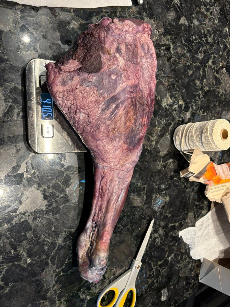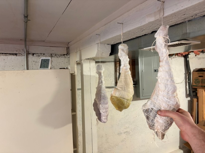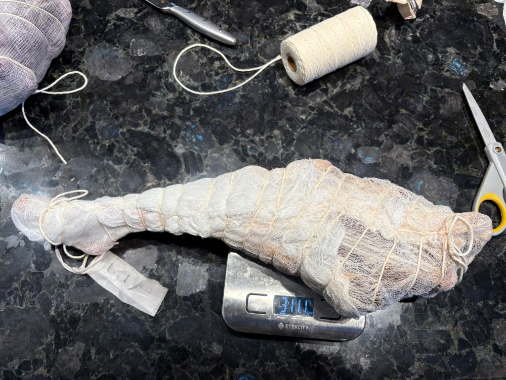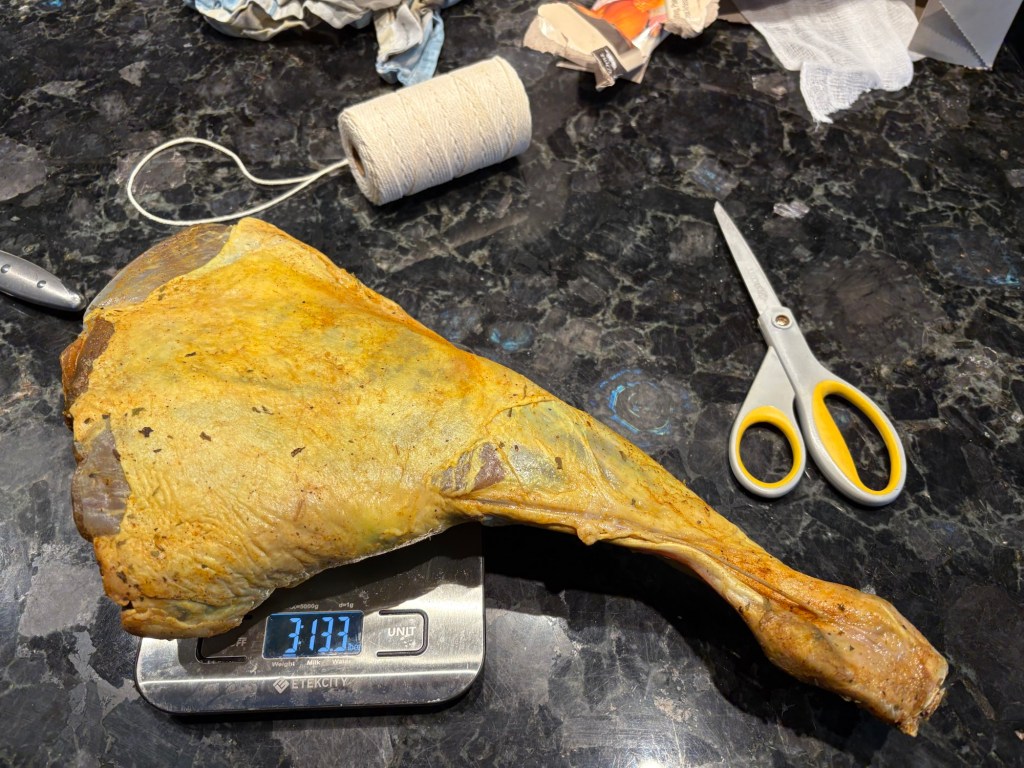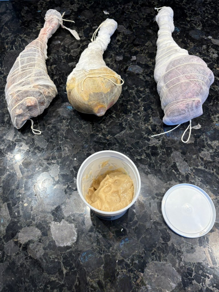 Wrapped all of them in cheesecloth, but unfortunately, I put too much flour in the strutto so it wouldn’t stick to the leg, so we had to put it aside. I’ll mix more later, if these start getting case hardened.