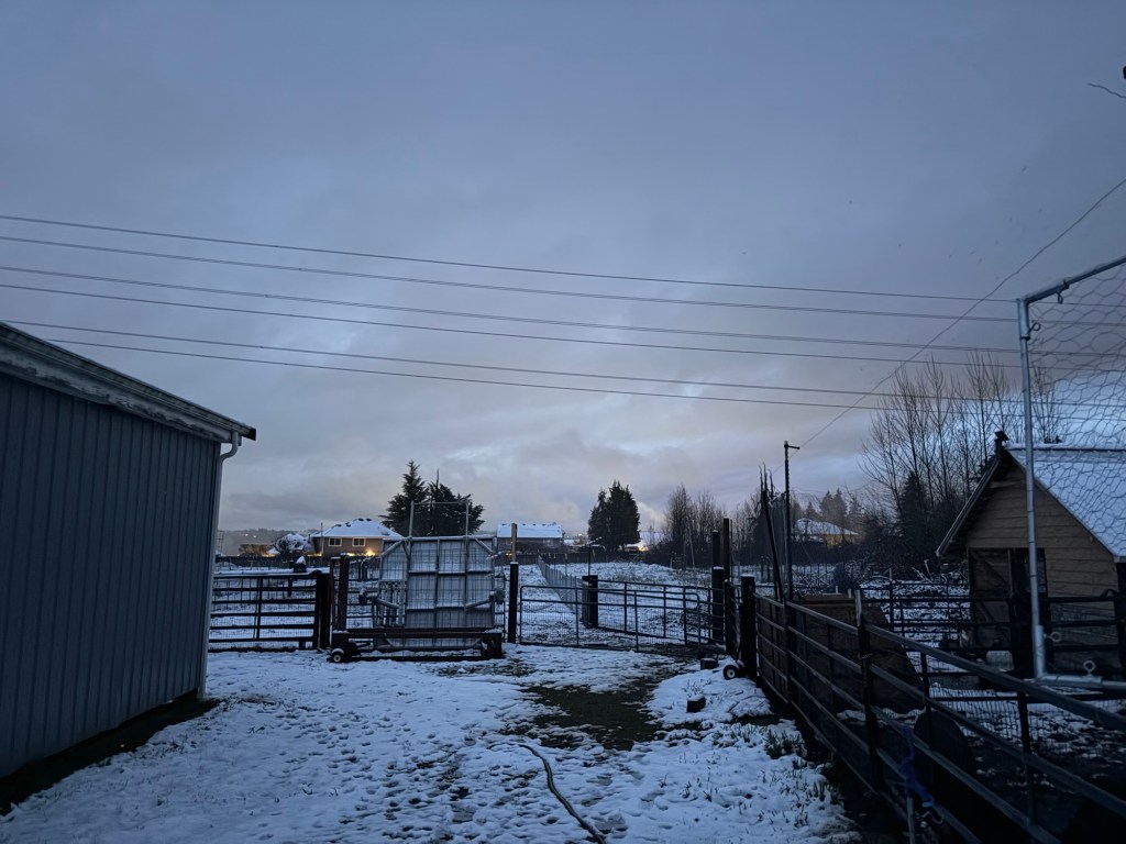 We had originally been planning on butchering our big Meishan barrow (“Bacon”) this coming weekend, but the weather is going to be over 40 degrees all night, several nights in a row. In fact, last weekend was likely our last night below 40 degrees. We got a couple of inches of snow over night, which the kids thought was amazing. Unfortunately, while it might have been an adequate weekend for butchering, we had too much else going on, so we didn’t get to it. So now we will have to outsource that to professionals.