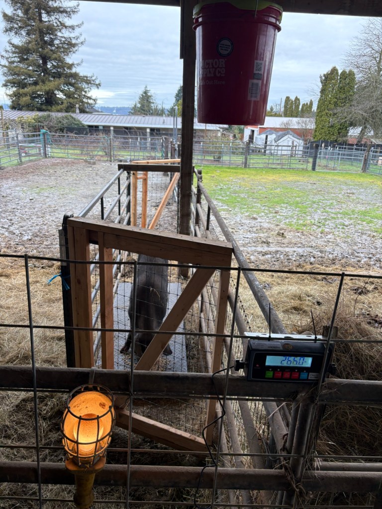 Because we want to be able to give our customers an accurate live-weight assessment for the pigs they bought, we need a scale. Because the scale needs to be on a flat, firm surface, under cover, accessible to all the livestock, it needed to be in one of the barn sections. Because it needs to be in the barn, the pigs had to be moved out of that section. Because it is sitting on footers and not on a pad, it needs to be closed off so the pigs can’t root around it, and the cow or sheep don’t kick it or play on it, so it needs gates.