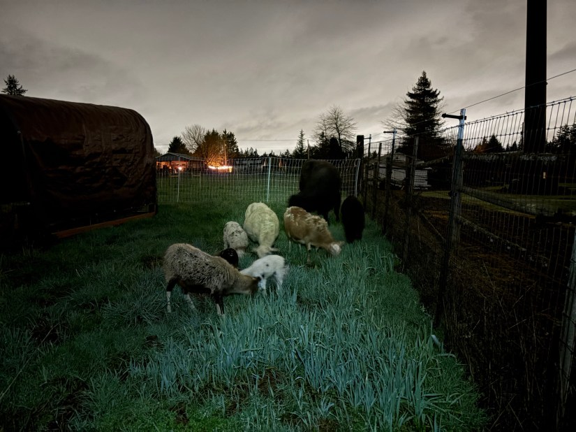 We have three lambs and a calf in our little flerd, and there has been some coyote activity in the area over the last few weeks. Also, there is not enough grass yet to sustain them in a small 40×50 foot paddock for 24 hours without over-grazing. So we are bringing them in to the barn at night, and taking them back out in the morning.