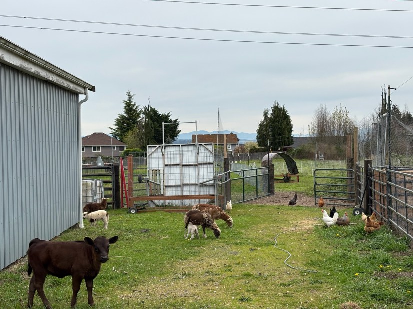 It doesn’t looks like it in this picture, but it actually got pretty warm on Monday, so all the critters were resting and chewing the cud in the shade of the compost bin and chicken coop. Except Iris.
